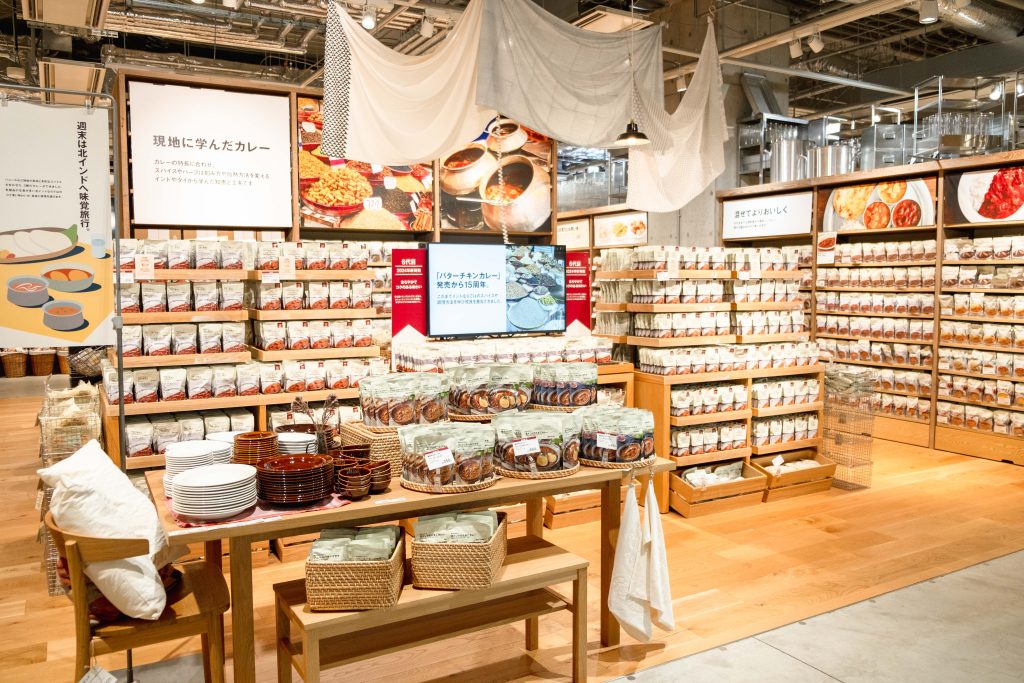 1階は食品のフロア。温めるだけで、すぐにおうちで本格的な味が楽しめるレトルト食品や冷凍食品など、無印良品の人気の食が詰まった売場です。ファミリーがゆっくり食事を楽しめるカフェもあります。