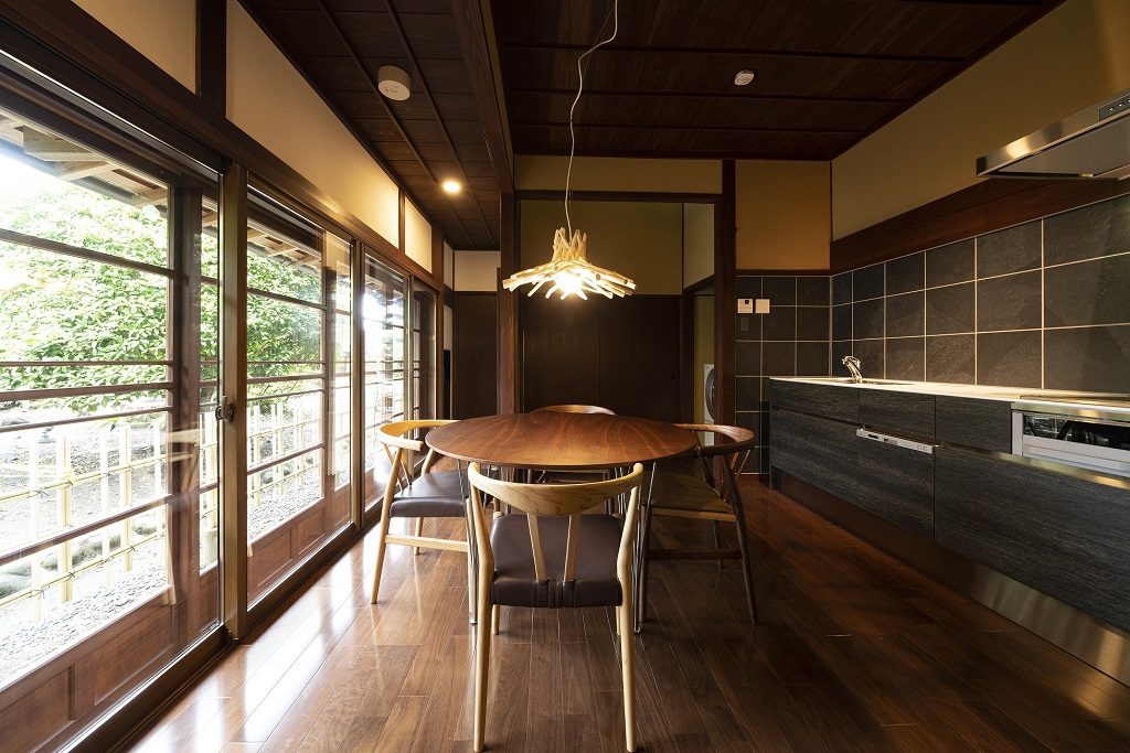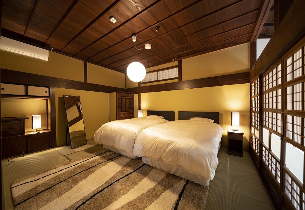飯塚邸は、築200年を超える有形文化財である日本の伝統建築をリノベーションした古民家ホテル。古民家といっても、最新の電化製品をはじめ、ベッドやソファなどのインテリアを備えた、現代的で快適な空間です。
