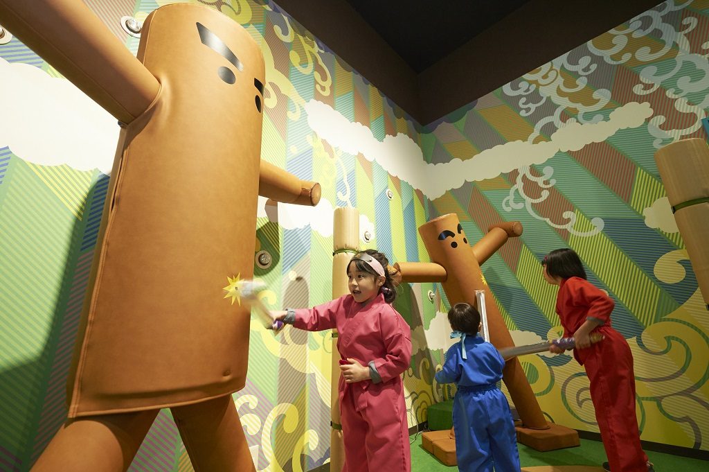 「忍者修行道場 刀でGO!」は、刀を持って様々な忍者修行にチャレンジしていくアトラクションです(有料)。使用する刀はビニール製なので小さい子どもでも安心。“丸太橋わたり”や“鳴子くぐり”のほか、随所に現れる木の人形やしゃぼん玉を刀で斬っていきます。たっぷり体を動かすことができるので、修行が終わる頃には達成感と爽快感が得られるはずです。