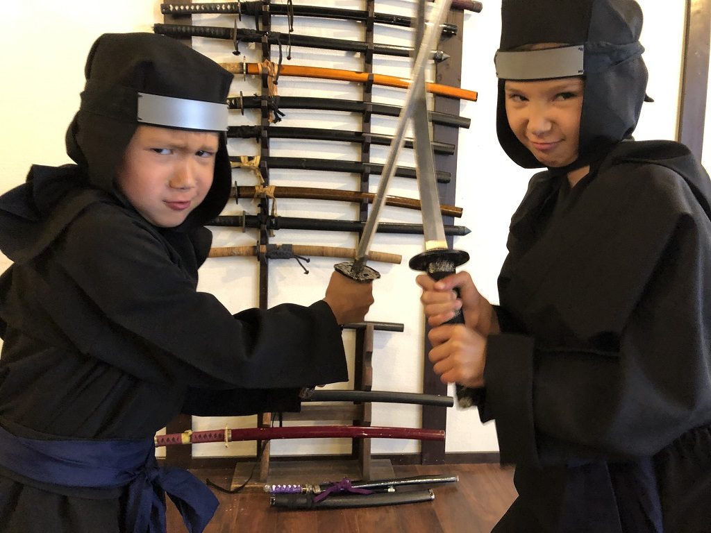 どちらのプランにも含まれるベーシックな体験内容が、博物館の中の見学、手裏剣投げ体験、サムライのコスチューム体験です。写真の忍者の秘密授業では、日本の歴史における忍者についてと、彼らが秘密の任務に使用した武器や道具、忍術などが学べます。手裏剣投げ体験では、ターゲットに狙いを定めてレプリカの手裏剣を実投。甲冑コスチュームと本物の兜を身につけたり、かっこよく刀を構えて撮影ができる甲冑着用撮影、侍の刀体験も人気です。