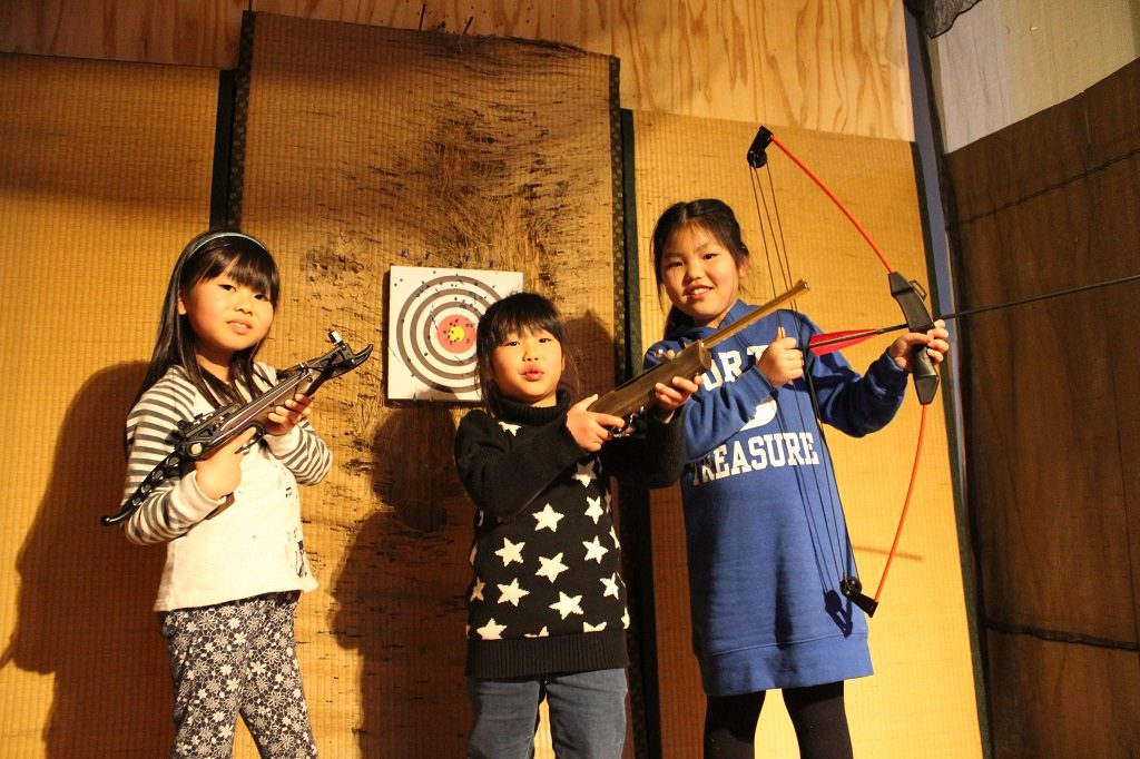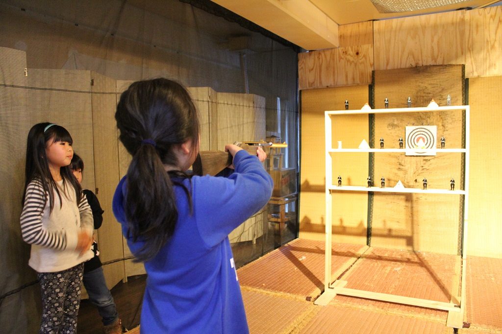 道場では、手裏剣や吹矢などの忍者アイテムをはじめ、射的やコルク鉄砲などが体験できます。なかなか触れる機会がない“打ち物”の体験ができるので、子どもも大人も興味津々。それぞれ1回500円で体験でき、的に当たると景品やお菓子がもらえます。鉄製の本格的な手裏剣や重量感のある弓矢など、小さい子どもには取り扱いができないものもあるので、大人が体験してみせてあげましょう。