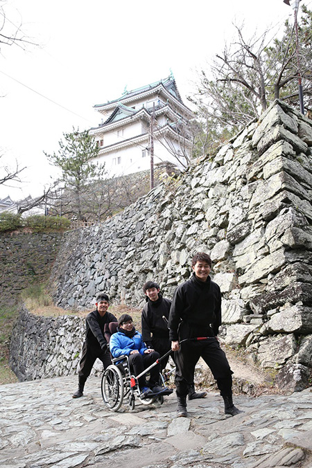 和歌山城がある和歌山城公園内に潜むおもてなし忍者は、「おもてなしの術」をあやつり、観光に訪れる人々のサポートを行う頼もしい忍者です。ベビーカーの運搬やオリジナル車いすによる搬送などの登城サポートで、天守閣前広場前までの案内を行っています。そのほか、忍者作成のオリジナルマップによる道案内、記念撮影のお手伝い、かくれみの術による石垣からのサプライズ登場など。とにかくサービス精神旺盛!