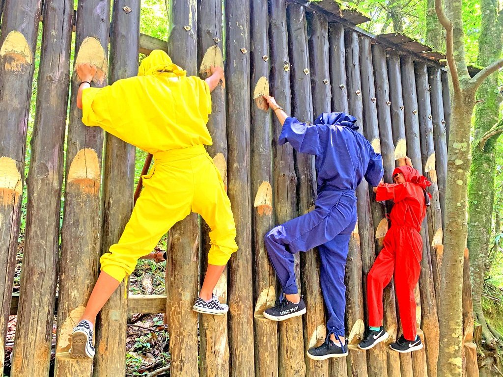 「忍者道場」では、石垣のぼり、塀越え、塀横歩き、壁つたい、綱わたり、坂道上り、一本渡り、井戸抜け、水蜘蛛、と9つの忍者修行を体験できます。すべてクリアすると巻物を手に入れることができるので、張り切って挑戦しましょう。