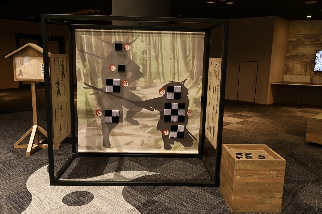 「手裏剣道場」では、ずっしりと重みのある本格的な手裏剣で的あてにチャレンジ(300円/6枚)。スタッフのアドバイスもあるので、初めてでも安心です。
