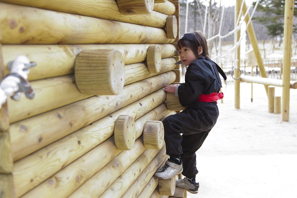 「忍術皆伝の道」は、壁をつたって進む「つたい壁」や、仕掛けがたくさん潜む「からくり迷路」などが楽しめる12種類のアスレチック。それぞれの立札に書かれた指令をクリアしていけば、俊敏性や忍び足など忍者スキルを鍛えられます。