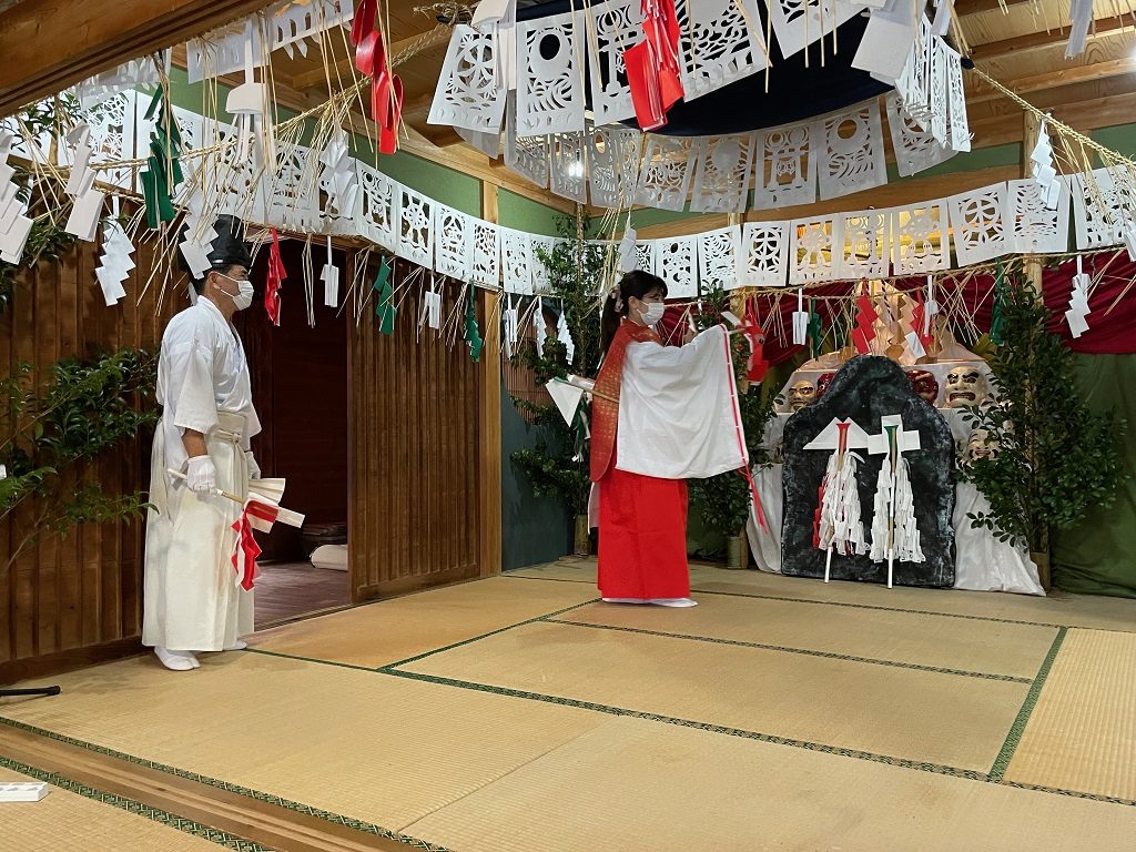 ※神庭(こうにわ)とは・・・神庭は神楽を舞う場所です。庭には「山」と呼ばれる一間四方の外注連(そとじめ)が設けられ、神楽が舞われる神楽宿の中央の部屋(おもて)には二間四方の内注連「神庭」がつくられます。
