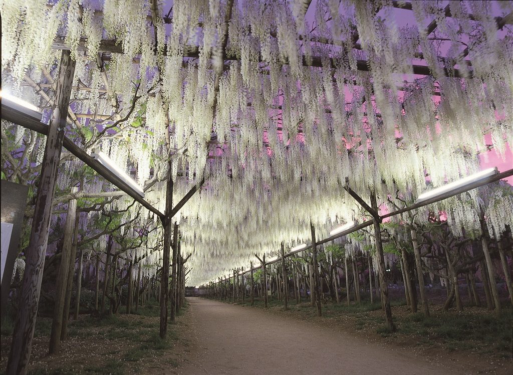 栃木県天然記念物に指定されている長さ80メートルの白藤のトンネルもフラットな道が続くので観賞しやすく、純白で神々しさを感じる特別なスポットをゆっくりと眺めることができますよ。