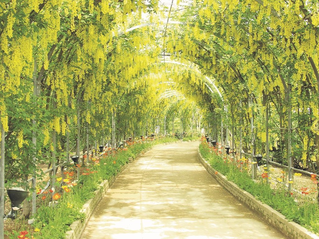 続いて、黄色い蝶が集まったような花房が可愛らしい、きばな藤のトンネルです。春の柔らかい陽光を浴び、光り輝くトンネルはまさに夢の世界!あしかがフラワーパークでは紫色の藤だけでなく、うす紅、白、黄色の藤を開花時期を少しずつずらしながら楽しめます。
