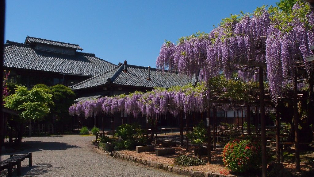 新潟県にある北方(ほっぽう)文化博物館も、藤の花が代名詞になるほど見応え抜群のスポット。8800坪ある広大な敷地の中央では、樹齢150年、80畳分の面積に花の長さ1mほどの圧巻の藤が望めます。近くにある主屋の2階からも藤を広く見渡せることができます。藤を上から見下ろす機会はなかなかないもの。地上から見上げるのとは違った雰囲気を楽しんでみてください。
