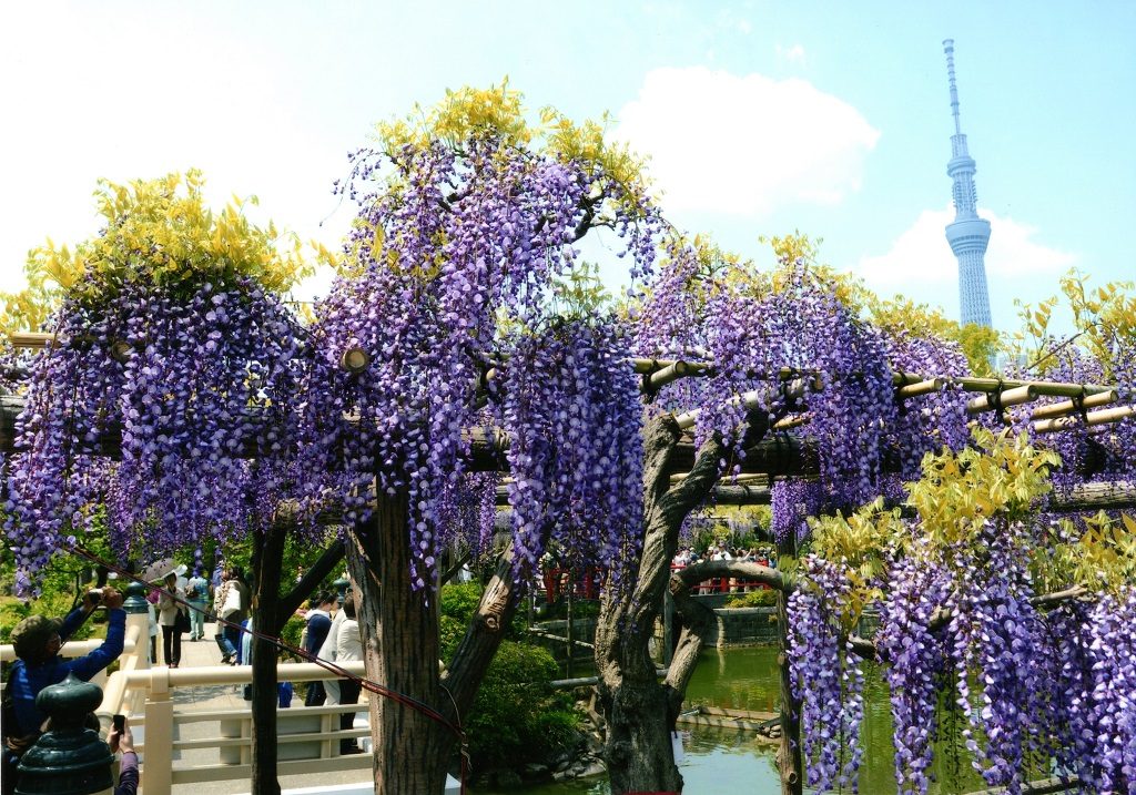 実は、亀戸天神社からスカイツリーまでは徒歩約20分という位置関係。そのため「スカイツリーを背景にした藤の花」という写真も叶います。天神様で参拝と藤観賞をした後はスカイツリーまで歩き、下町の雰囲気を感じながらお散歩するのもいいですね。