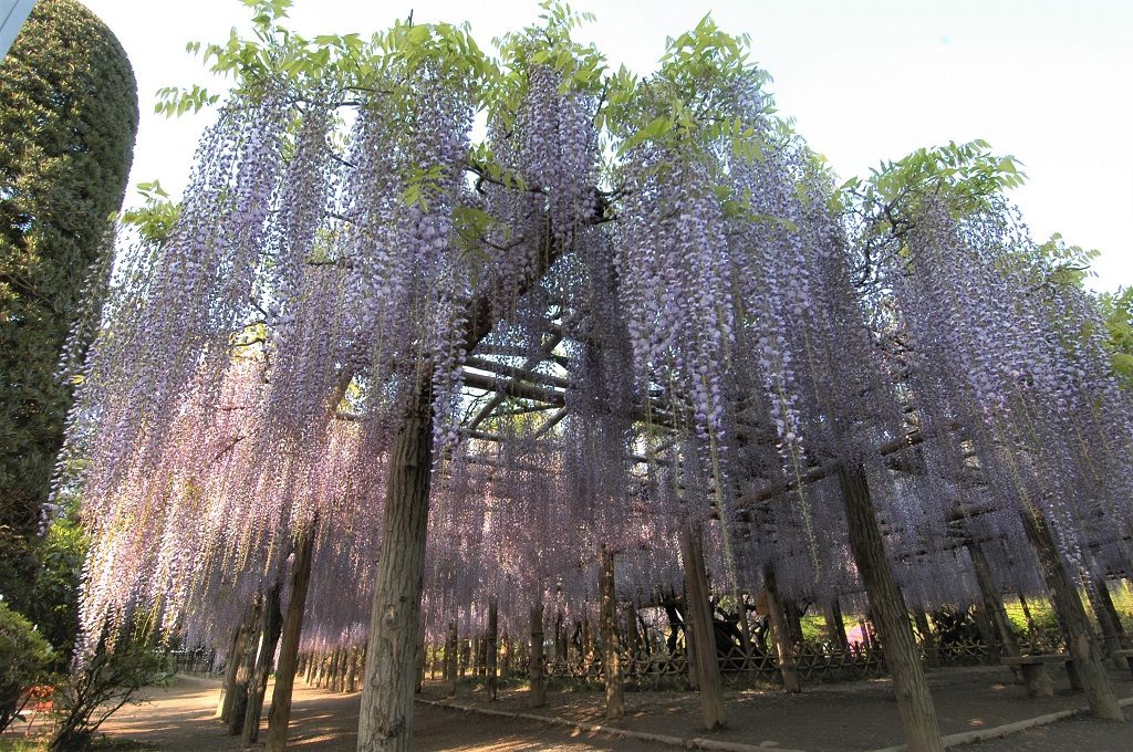 見どころは何といっても全長250mの藤棚!満開の藤の棚下を歩けば、優しい香りも堪能できるでしょう。そのほか園内には45種類もの藤が植えられているエリアがあり、ここでは紫色だけでなく白やピンク、また形も様々な藤の花を観賞できます。