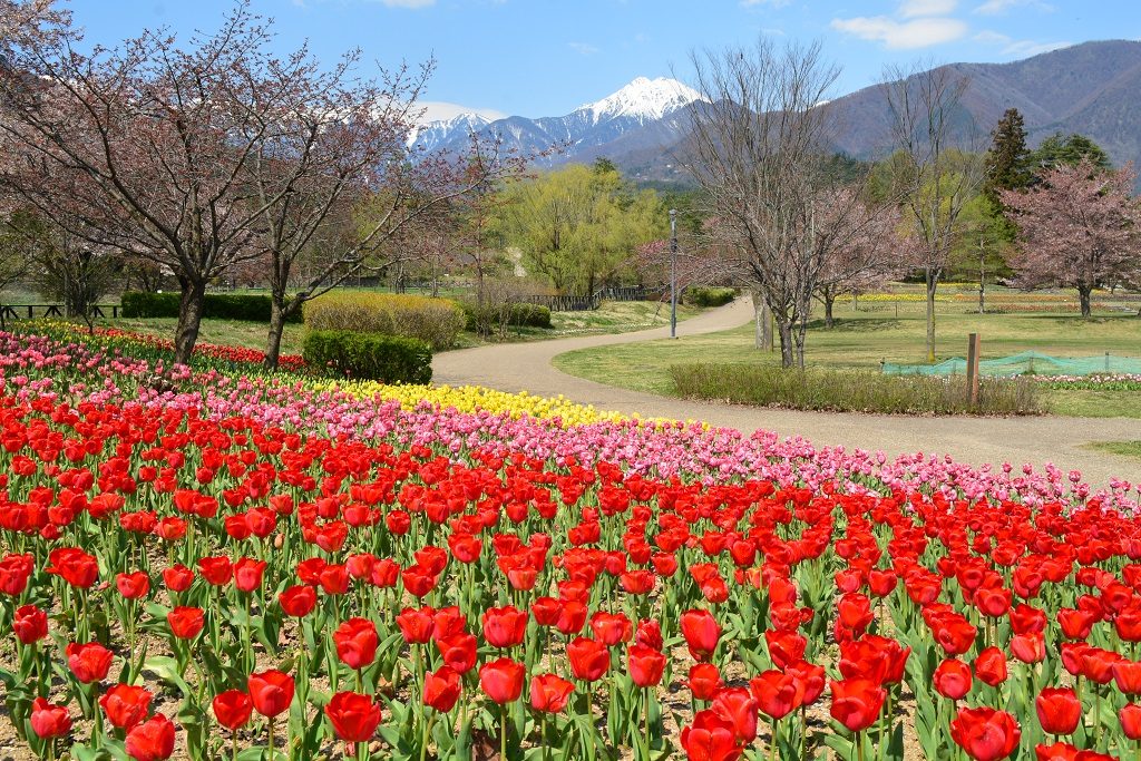 季節の花畑を楽しむなら、堀金・穂高(ほりがね・ほたか)地区にある田園文化ゾーン内にある花畑がおすすめ。チューリップなど春の花からはじまり、9月中旬~10月中旬頃のコスモスまでの約7ヵ月間、様々な季節の花を楽しめるのが見どころのひとつです。