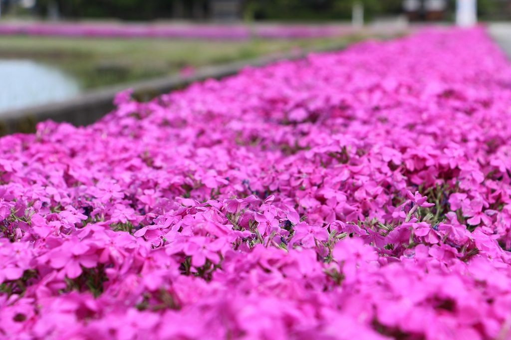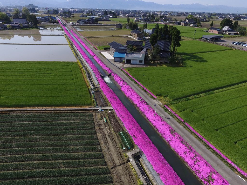 富山県西部に位置する砺波市(となみし)の新屋敷地区では、4月末から5月にかけて岸渡川(がんどがわ)の両岸に沿って芝桜が咲き誇ります。川のように長くその長さ約800メートル、と圧巻です。さらに驚きなのは、これらの芝桜は地元の有志の方たちによって植えられたということ。新屋敷地区の美しい田園風景の保全を目的に2010年からスタートしたといいます。住民の多くが毎月交代で雑草取りや、新しい苗を植えたりと世話を続け、芝桜のじゅうたんを広げてきたそう。過去には、芝桜の開花にあわせてフォトコンテストや芝桜の苗の販売が行われたこともあります。