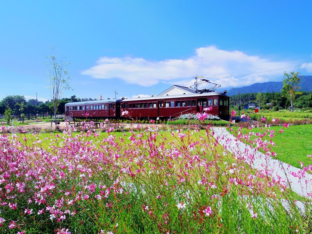 いわさきちひろが挿し絵を担当したことでも有名な作品「窓際のトットちゃん」にちなんで、公園の一角に作られた「トットちゃん広場」にもぜひ立ち寄りましょう。広場にあるレトロな2両の電車「電車の教室」は中に入ることができ、絵本の世界観や実際に絵本を楽しむこともできます。乗り物好きの子どもも、絵本好きの子どもも楽しめそうですね。そのほか園内には、松川村の食材を使って郷土食づくりなどの体験ができる体験交流館などのスポットもあります。