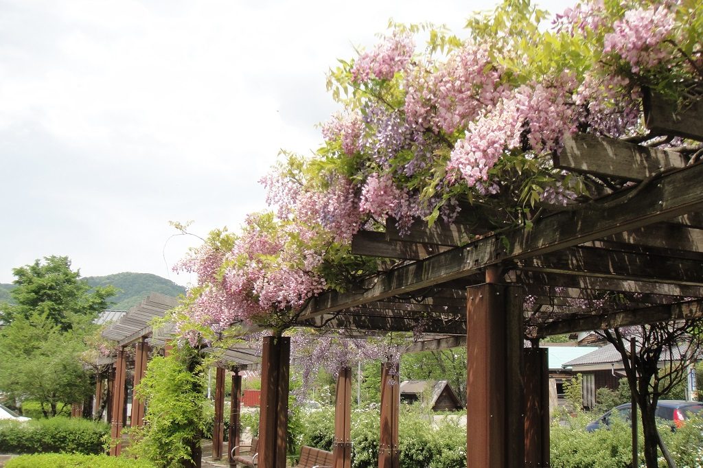 なかでも「花」をテーマにした吉岡園地の散策がおすすめです。広さ7.6ヘクタールの敷地内には芝生広場、ロックガーデン、大花壇、水生植物園が点在し、四季折々違った表情を見せてくれます。毎年5月頃に見頃を迎える藤棚も圧巻です。エントランスの芝生広場には子どもが遊べる遊具もあるので安心ですね。