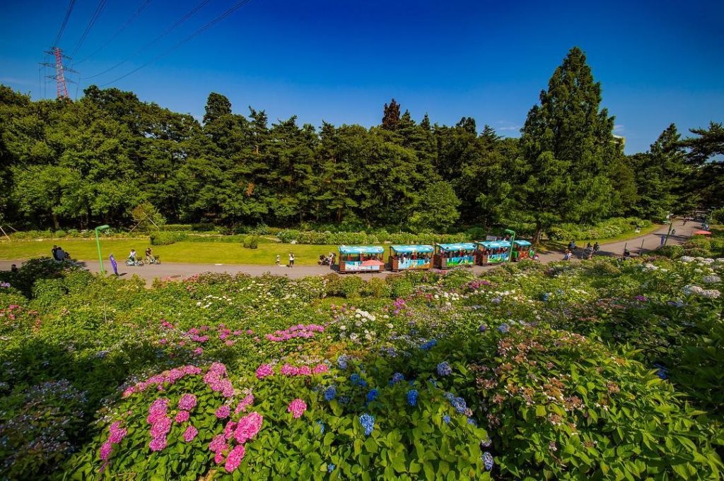 春から秋にかけて様々な花が園内に咲き誇りますが、なかでも特におすすめなのが6月中旬〜7月上旬に楽しめるあじさいです。園内の中央付近にある「あじさい通り」では、両側斜面を約100種、2万株ものあじさいが埋め尽くします。電車や乗り物が好きな子どもなら、園内を周遊する電車を模した車両トレーン (1回につき中学生以上/350円、4歳以上小学生以下/100円)の利用がおすすめ。あじさい通りを通過する際、少し高い目線から見えるあじさいは記憶に残る風景になるかもしれません。トレーンは園内をぐるっとひと回りしてくれるので、はじめて訪れるファミリーには園内を把握するのにもおすすめです。