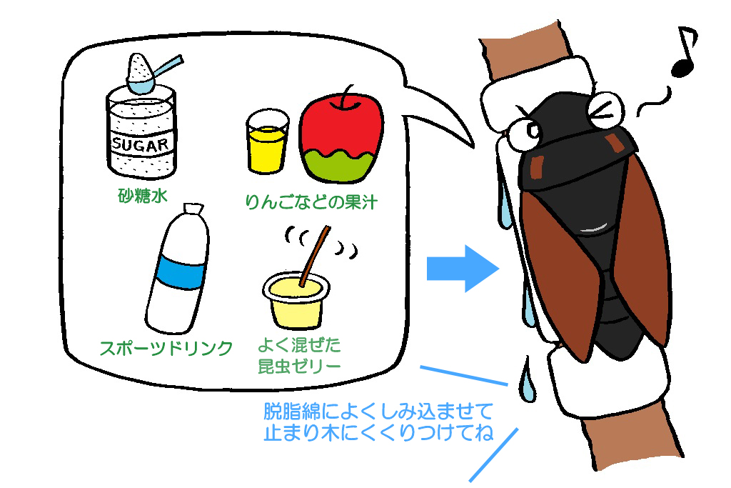 植木に放せば、セミは枝や幹に針のような口をさして樹液を吸ってくれるので、特にエサをあげる必要はありません。ただ、植木がすぐに用意できない場合は、砂糖水やスポーツドリンク、果汁、かき混ぜて液体状にした昆虫ゼリーなどを脱脂綿によくしみこませて止まり木にくくりつけておきましょう。1日程度なら、樹液の代用品になります。