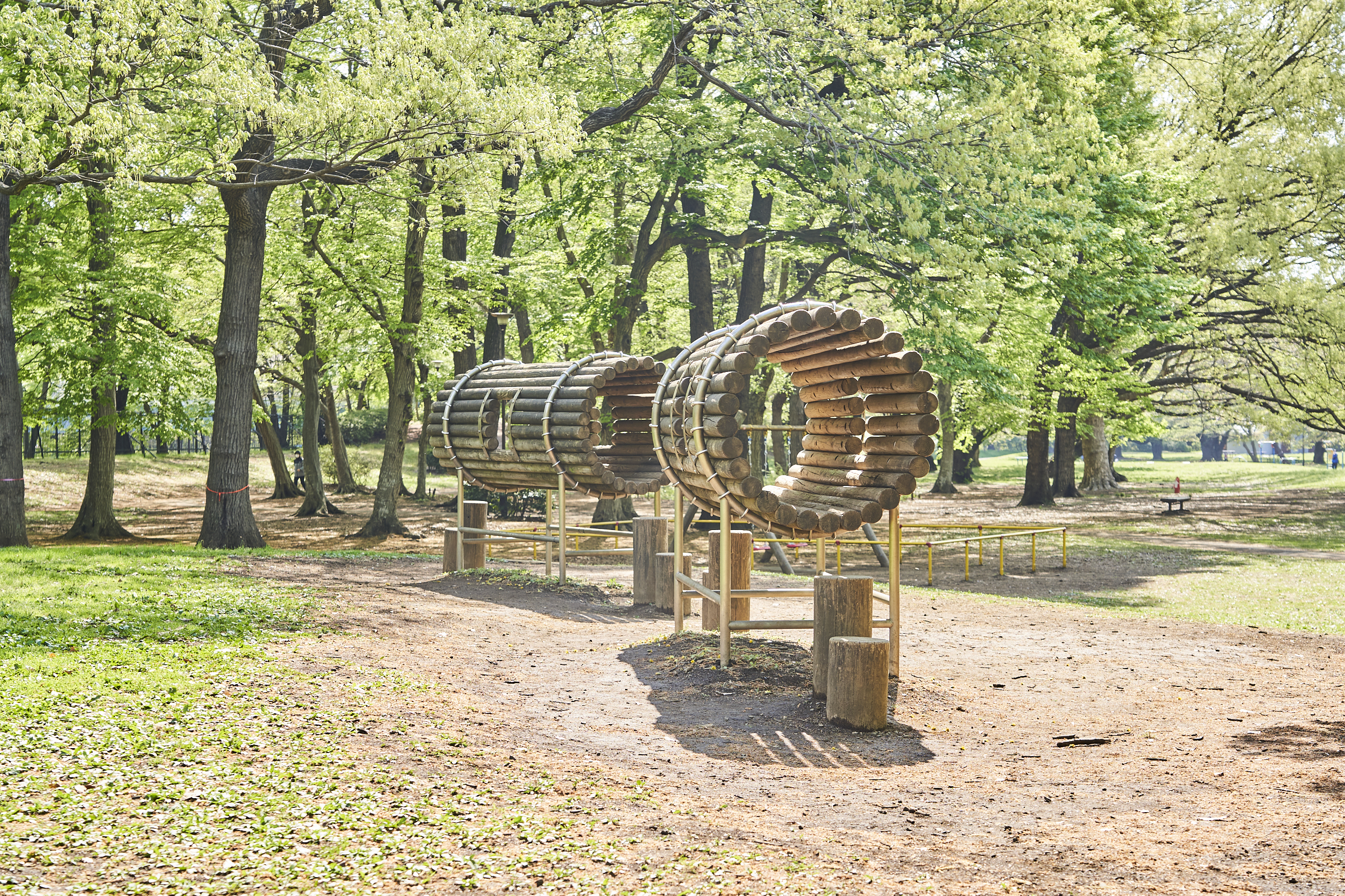 子どもの冒険心をくすぐる遊具も人気です。秘密基地のようなたたずまいが目を引く丸太トンネルは、広場のアイコン。見つけたとたん、年齢を問わず「あれに入りたい!」と子どもたちが駆け出します。意外と高さがあり、手すりのない丸太の階段を上るのに幼児はサポートが必要かもしれません。窓から顔を出す子どもたちの嬉しそうなことといったら!