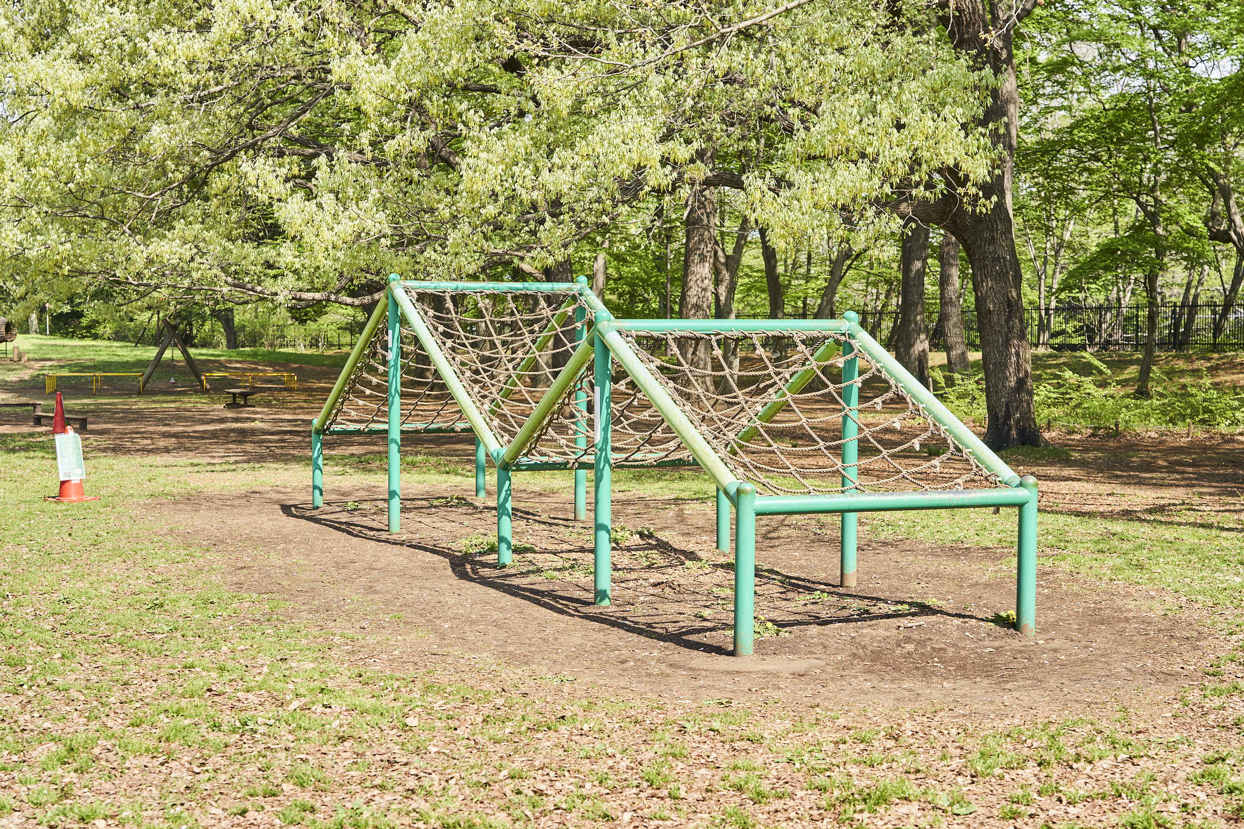 複合遊具から東側にはアスレチックコースがあります。感覚を開けて点々と並ぶアスレチック遊具は、周囲の自然に溶け込むような素朴な趣。「わたる」系の遊具なら、平均台のほかに丸太やロープを渡るものがあったり、ネット遊具なら、斜面を上り下りするものがあれば垂直に上り下りするものもありと、バリエーションが豊富なので、さまざまな形で基本動作が経験できます。ぜひ全遊具制覇を目指しましょう!