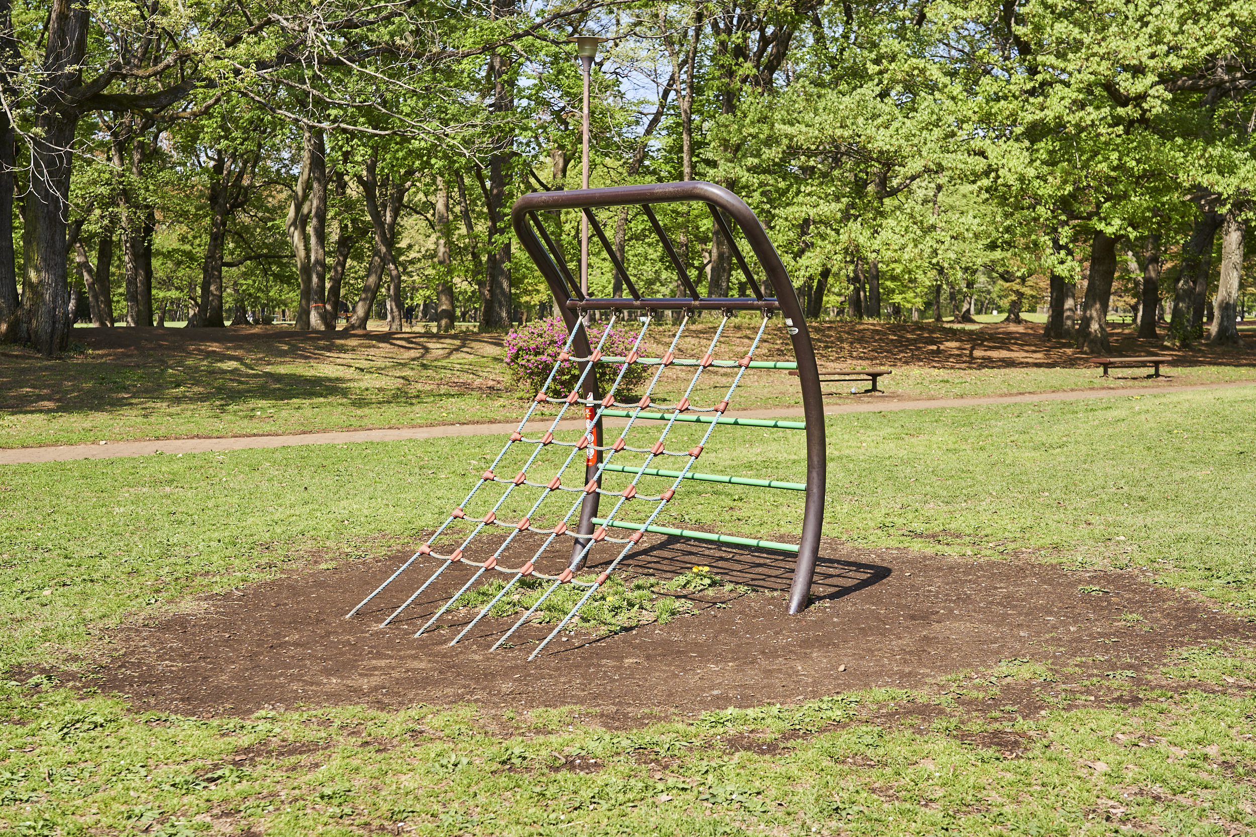 いくつかあるネット遊具の中で最も長い距離を上り下りして遊べるのが、大小2つのネットの山がつながっているタイプです。手足を使って全身運動になり、バランス力も鍛えられます。端から端まで行ければ達成感も得られるはず。対象年齢は6-12歳なので、まだ難しい低年齢の子どもは、小規模な遊具から挑戦してみてください。