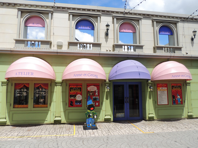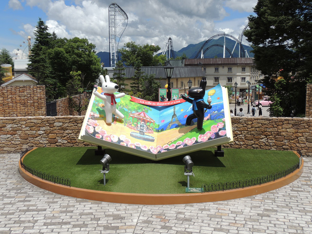 「リサとガスパールのそらたびにっき」は、第1入園口から見て園内奥のほうにありますが、テーマエリア「リサとガスパール タウン」は、第1入園口に入る前にあるんです。ココは、フランスの人気絵本のキャラクター“リサとガスパール”世界初のテーマエリアです。