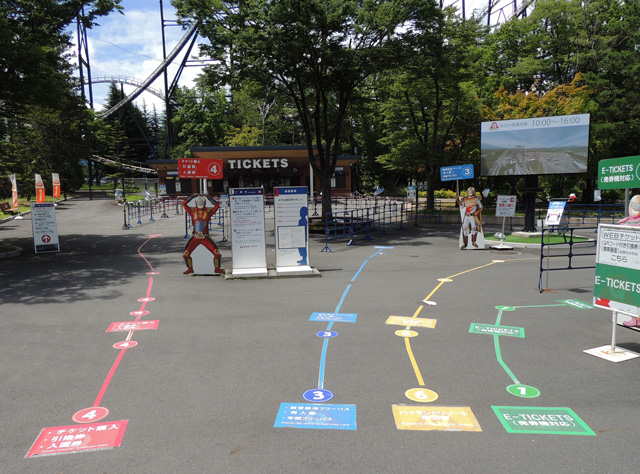コロナ対策としては、入園時の検温や各所での手指消毒などはもちろん、入口と出口を別にしたり、飛沫防止のためのついたて設置など徹底しています。飲食店・ショップのセミセルフレジやメニュー表や園内マップのオンライン化も対策のひとつです。