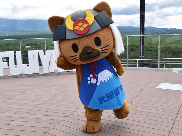 富士の国やまなし観光キャラバン隊長の“武田菱丸”くんも「FUJIYAMA タワー」オープンをお祝い(通常はいません)