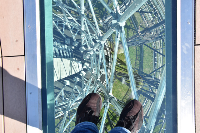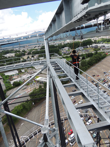 「FUJIYAMA タワー」の、もうひとつのアトラクションは「FUJIYAMA ウォーク」。これは、お兄ちゃん・お姉ちゃん、お父さん・お母さん、しかも勇気がある人だけどうぞ。ハーネスを装着して、手すりのない拭くさらしの吹きさらしの通路を1周…かなり怖いです。