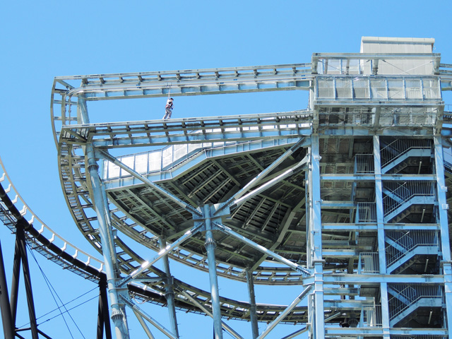 いよいよ新施設の紹介です。その名も「FUJIYAMA タワー」。キング・オブ・コースター「FUJIYAMA」の整備・点検をしているスタッフが、コース上部まで一気に登れる設備があれば…というところからはじまったタワー建設の話。せっかくだから「お客様にもこの絶景をご覧いただきたい」という思いから展望アトラクションとして一般の人も入れる施設になったわけです。