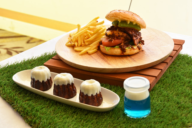 手前左が「カフェ ブリオッシュ」の富士山カヌレ1個300円、右が「レ レーヴ サロン・ド・テ」の富士山ゼリー350円、奥が「マカロニクラブ」の FUJIYAMA タワーバーガー1980円