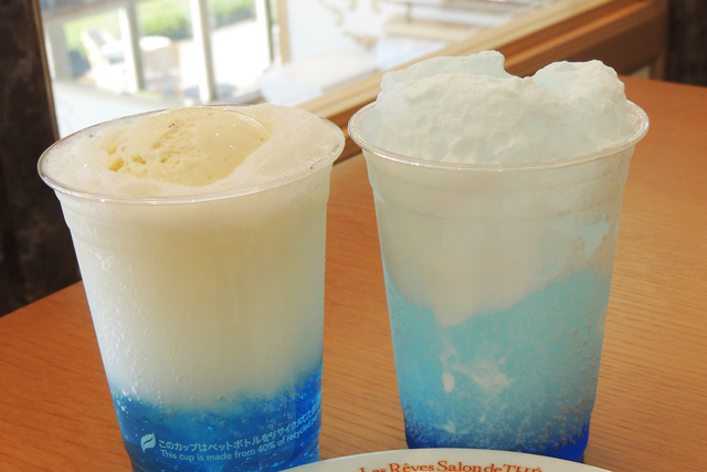 左が「カフェ ブリオッシュ」の青空クリームソーダ500円、右が「レ レーヴ サロン・ド・テ」の SORA スカッシュ700円