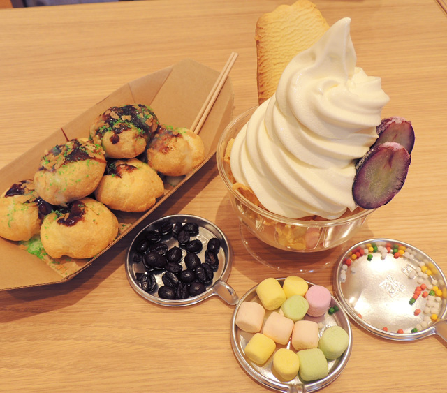 左が、たこシュー680円。右が3種のトッピングを選べるデコパフェ940円