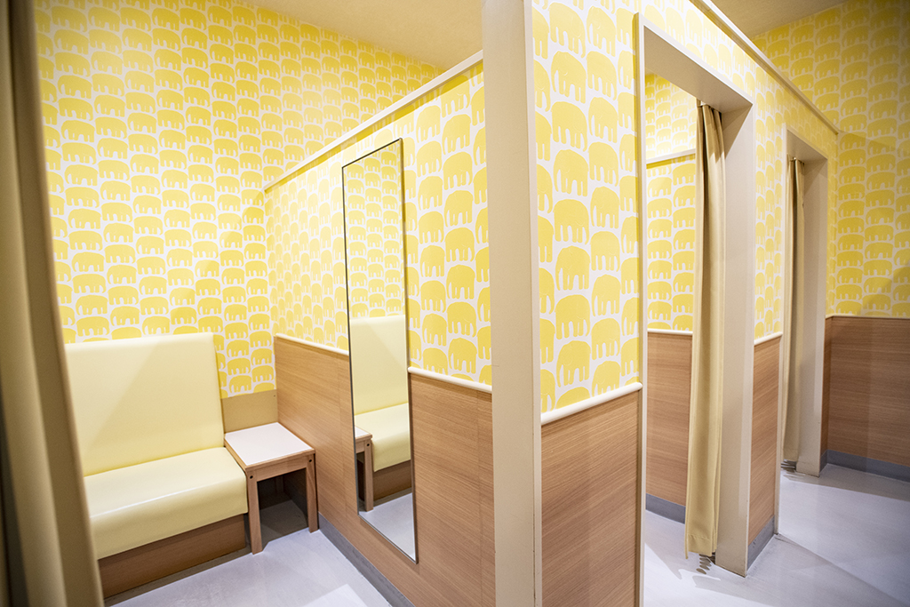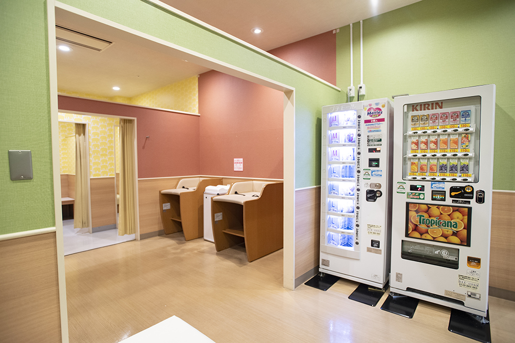 明るい雰囲気の授乳室を備えたベビーケアルーム。ゆったりと授乳ができる個室をはじめ、おむつ替え台やおむつやジュースの自動販売機も完備しています。
