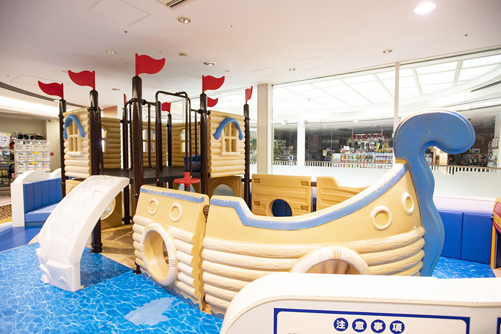 ベビーカー置き場やベンチも用意されたキッズスペースは、施設全体と同じく船がモチーフ。靴を脱いで船に乗り込めば、気分はすっかり船長さん!
