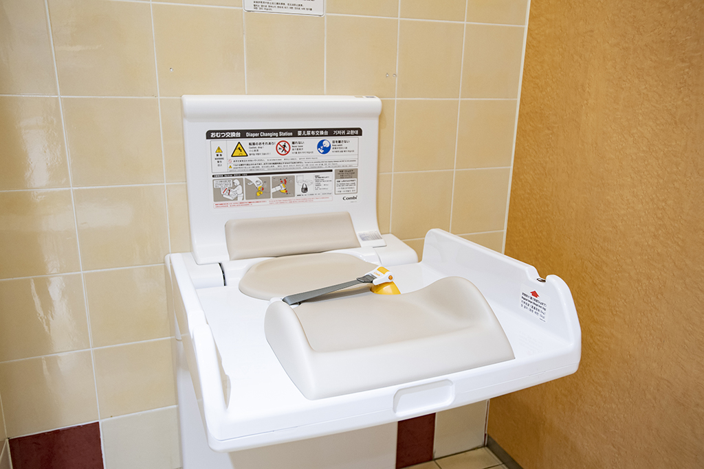 ベビーシートは多目的トイレと女性トイレの一部に設置。ベビーケアルームと併せて、おむつ交換の場所はチェックしておくと便利です。とてもきれいです。