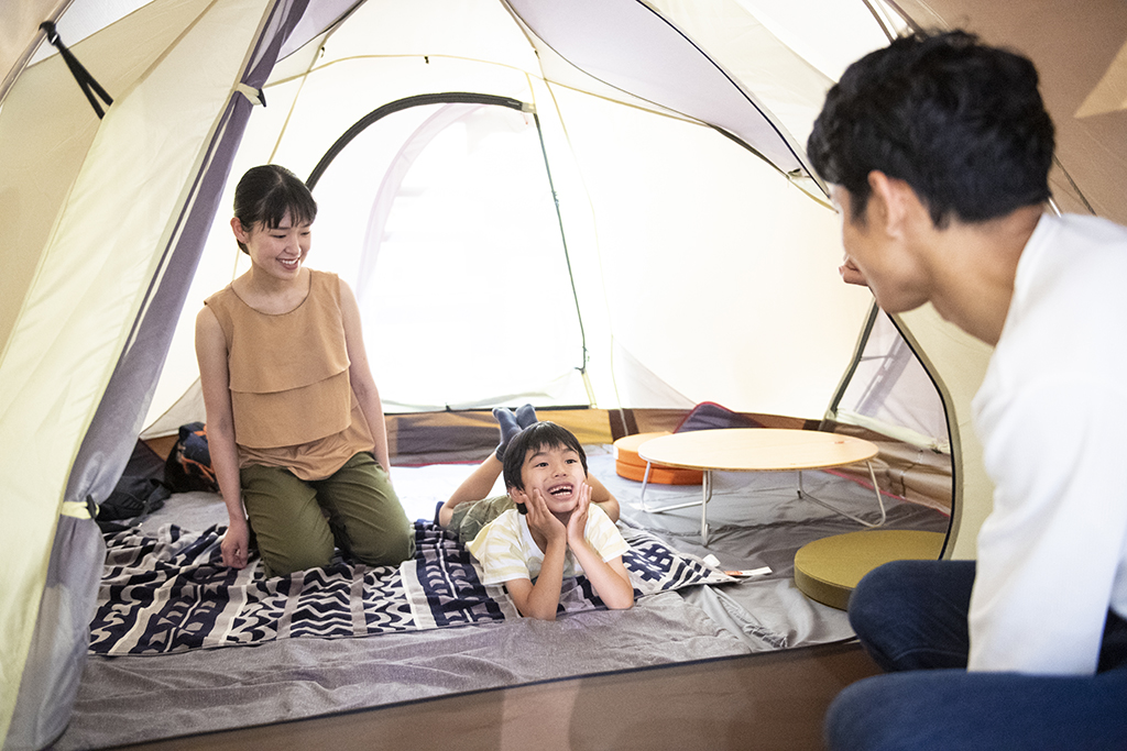 店内には複数のテントが展示。テントの中ではサイズを実感。「今年こそ家族でキャンプに行ってみたい!」とパパ。