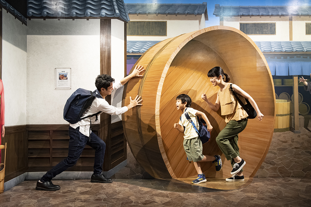 大きな樽の中に入って走って逃げる人と、そうはさせまいと止める人の様子をユーモラスに演出できる「樽泥棒」。江戸をテーマにした和風なトリックアートが並ぶ「江戸エリア」の作品のひとつ。