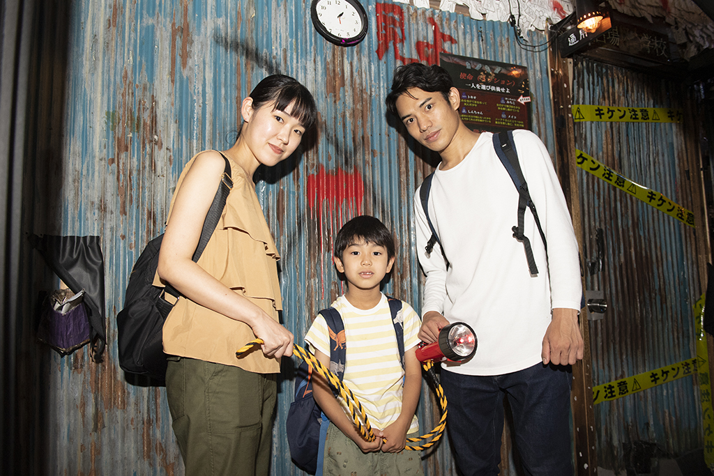 入場前は親子ともども緊張の表情。中は真っ暗なので、先頭の人が懐中電灯を持ち、あとの人はロープにつかまって歩いていきます。