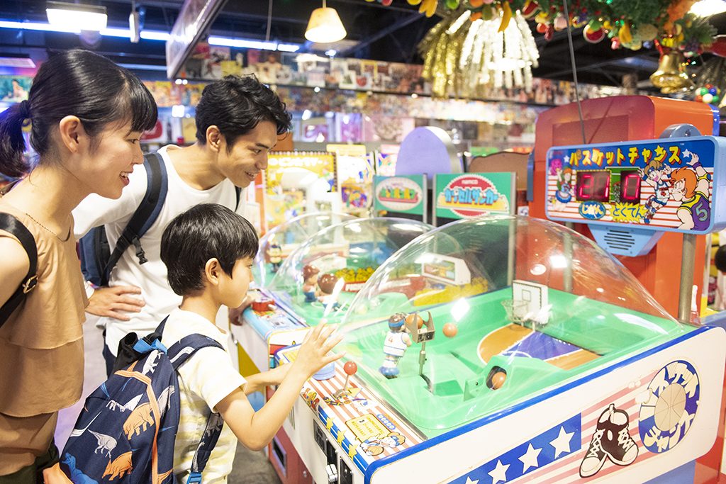 エスカレーターに乗ってシーサイドモール4Fに辿り着くと、そこには昭和の日本にタイムスリップしたような、懐かしの空間が広がっています。レトロ感いっぱいのアーケードゲームなど、100台以上のゲーム機が集まった「一丁目プレイランド」や、江戸をテーマにした和風のトリックアートなどが楽しめる「東京トリックアート迷宮館」、学校の廃墟を舞台にしたお化け屋敷「台場怪奇学校」など、様々な種類のアトラクションやショップがずらり!