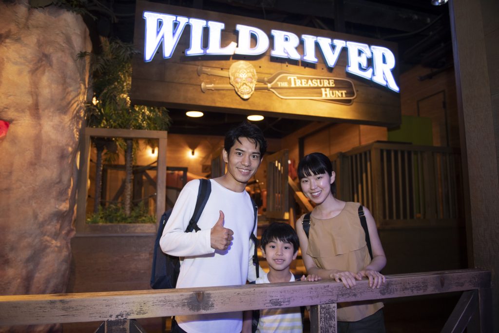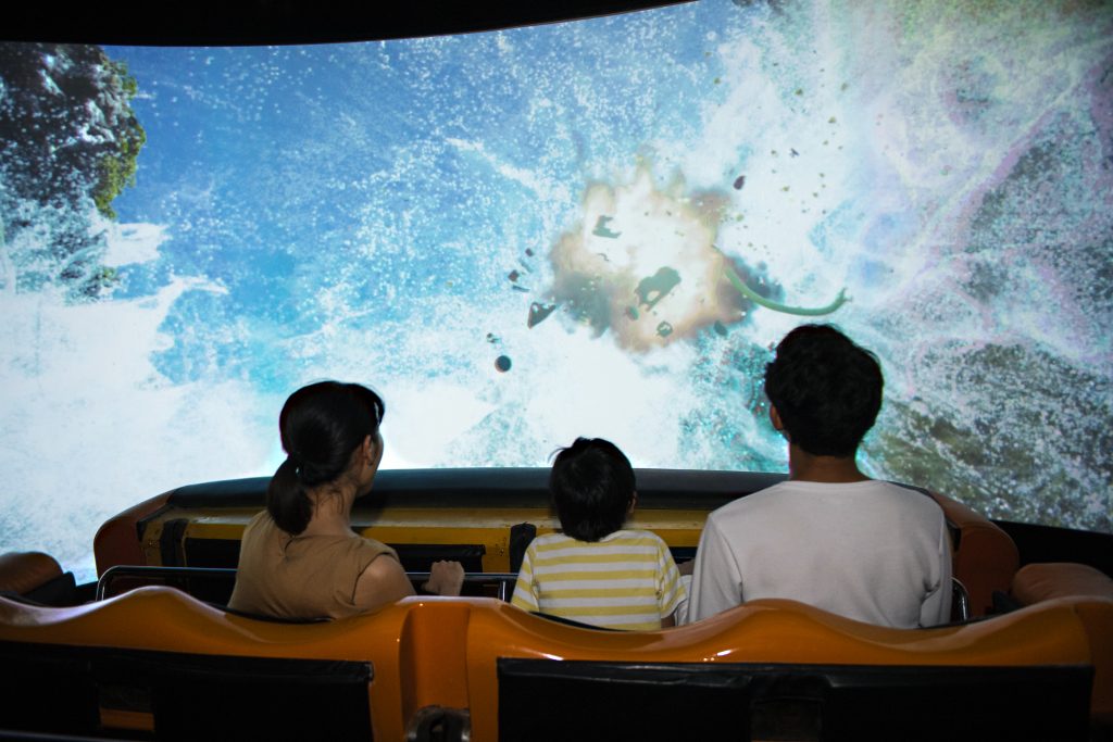 大自然を舞台に繰り広げる絶叫の冒険ツアーが「ワイルドリバー」。凄腕激流下りガイドのエリーと一緒に謎の秘宝を巡る大冒険を楽しみます。大きなボートに乗り込むと、大画面には激流の次は謎の洞窟……と、次々と新たな難関が登場。息をもつかせぬ、その名の通りワイルドなひとときが楽しめます。波に煽られ大きく揺れるボートの乗り心地は、かなりリアル!