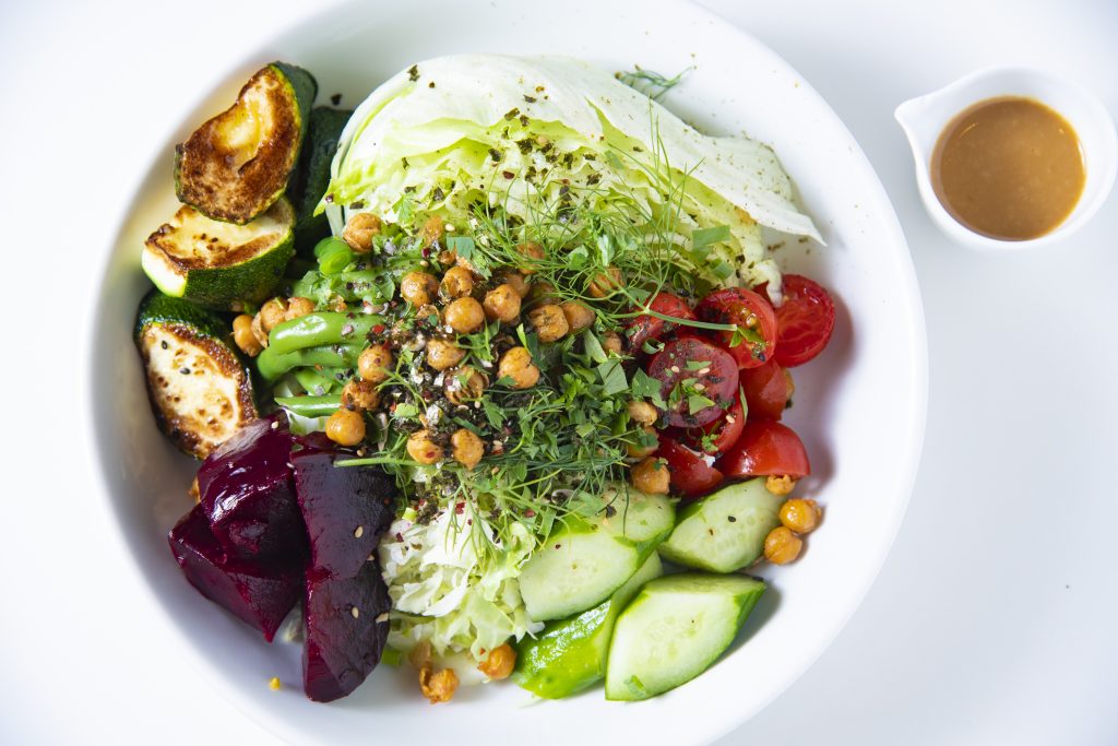 ランチメニューのひとつ「チョップドサラダ – グリーンビーンズ、ズッキーニ、ヒヨコ豆、ビーツ、セサミドレッシング」ランチ1500円、ディナー1600円。
