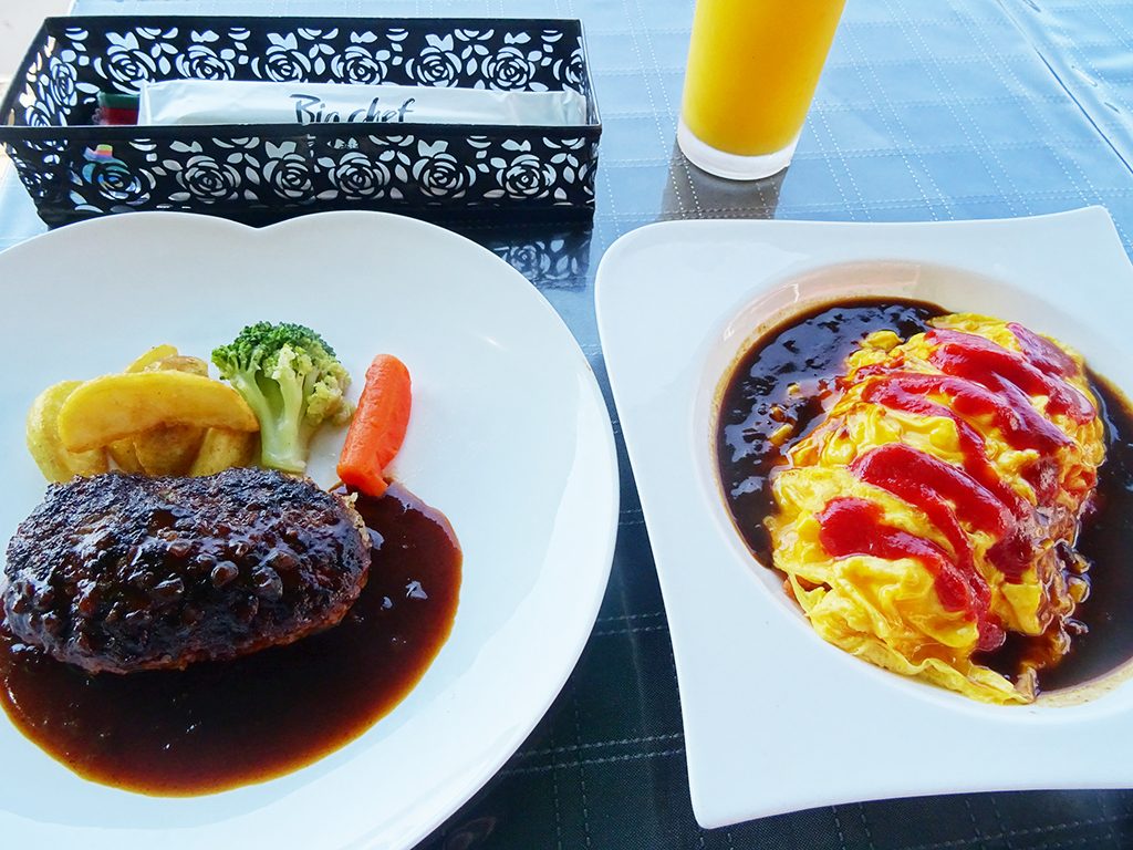 コンビメニューのなかでも大人気の「ハンバーグコンビ」。どっちも選べないという人にぴったりです。オムライスはデミグラスソースとケチャップ、両方の味が楽しめるのでお得感も抜群。