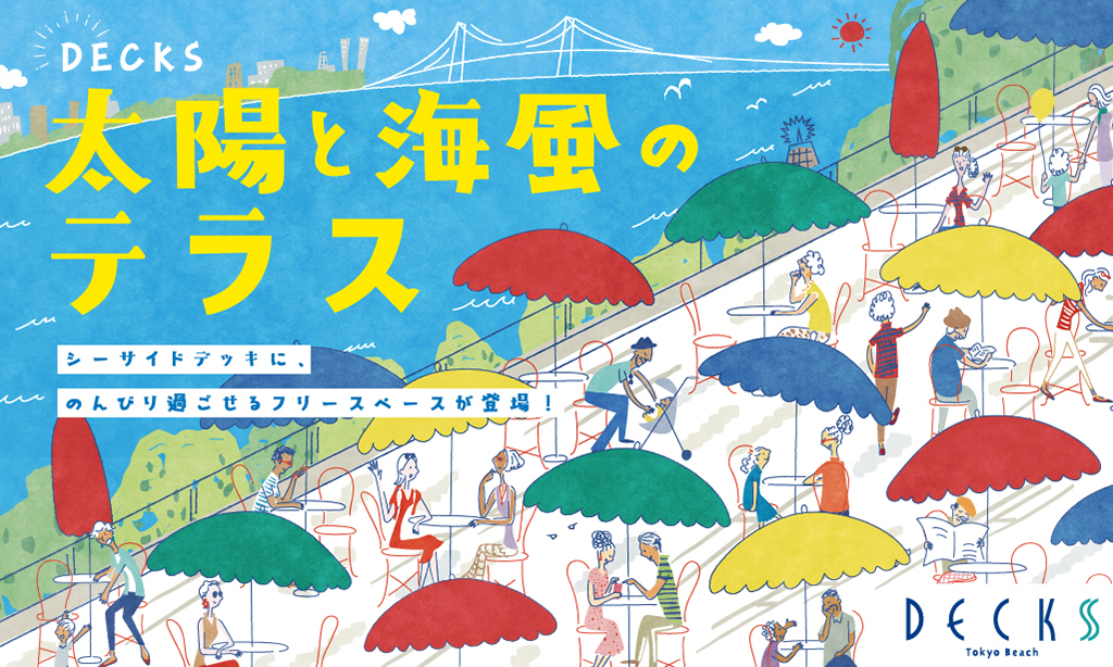 2021年7月21日(水)~8月22日(日)のうちの土・日・祝日を中心とした計14日間限定で、3Fシーサイド広場・シーサイドデッキ・5Fテラス席に、海風を感じながらのんびり過ごせるパラソル付きのフリースペース「DECKS 太陽と海風のテラス」が登場しています。シーサイドデッキ内のデリバリーメニュー特設受付ブースで、デックス東京ビーチ内の飲食店18店舗のおすすめメニューを注文すると、各店舗から受付まで料理が届くので、できたての美味しさをアウトドアで楽しむことができます。東京にいながら、ひとときのビーチリゾート気分が味わえるはず!