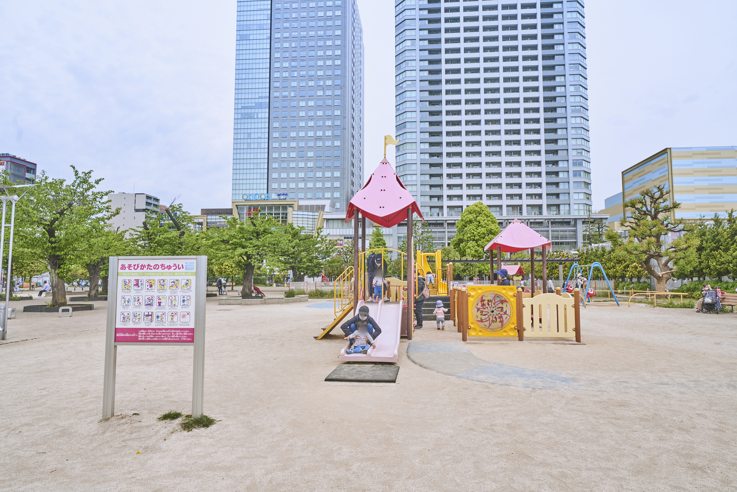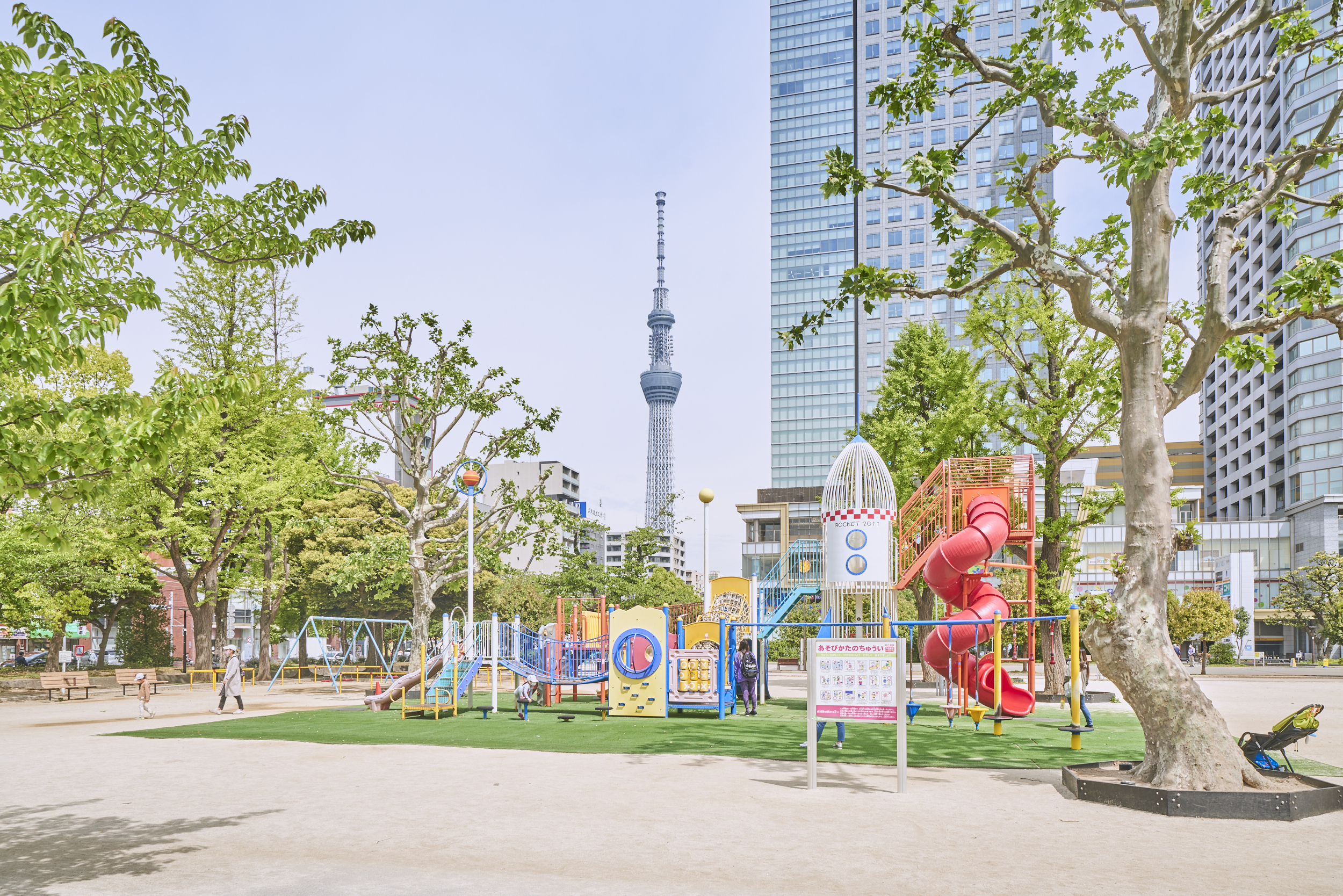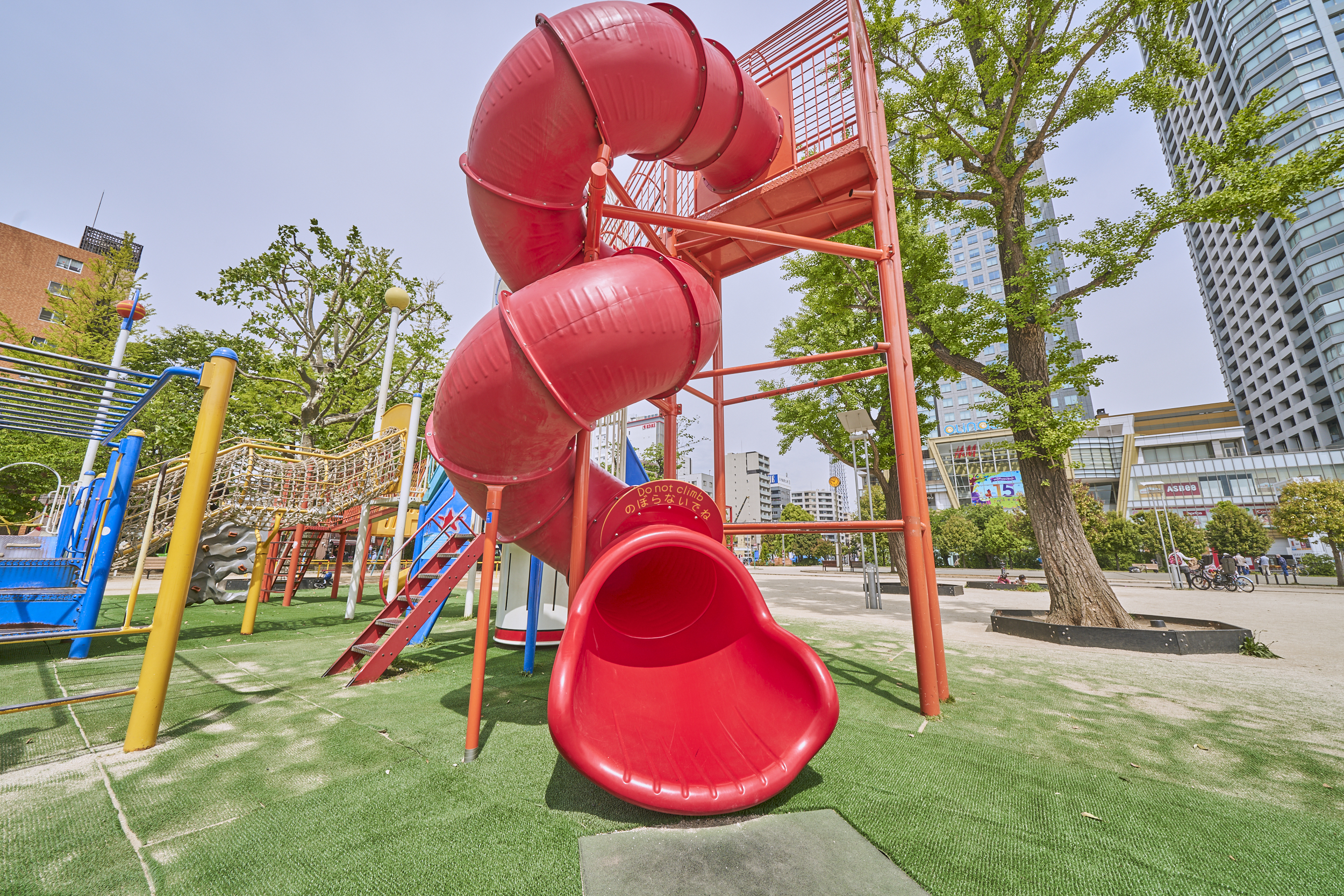 東京メトロの駅から直結と、超好アクセス。複合遊具で遊びつつ、芝生広場でのんびりもでき、電車を乗り継いで訪れる価値のある公園です。再開発の進んでいる錦糸町駅には商業施設もたくさんあるので、公園遊びを楽しんだ後はパパママのショッピングを楽しむこともできそうですよ。
