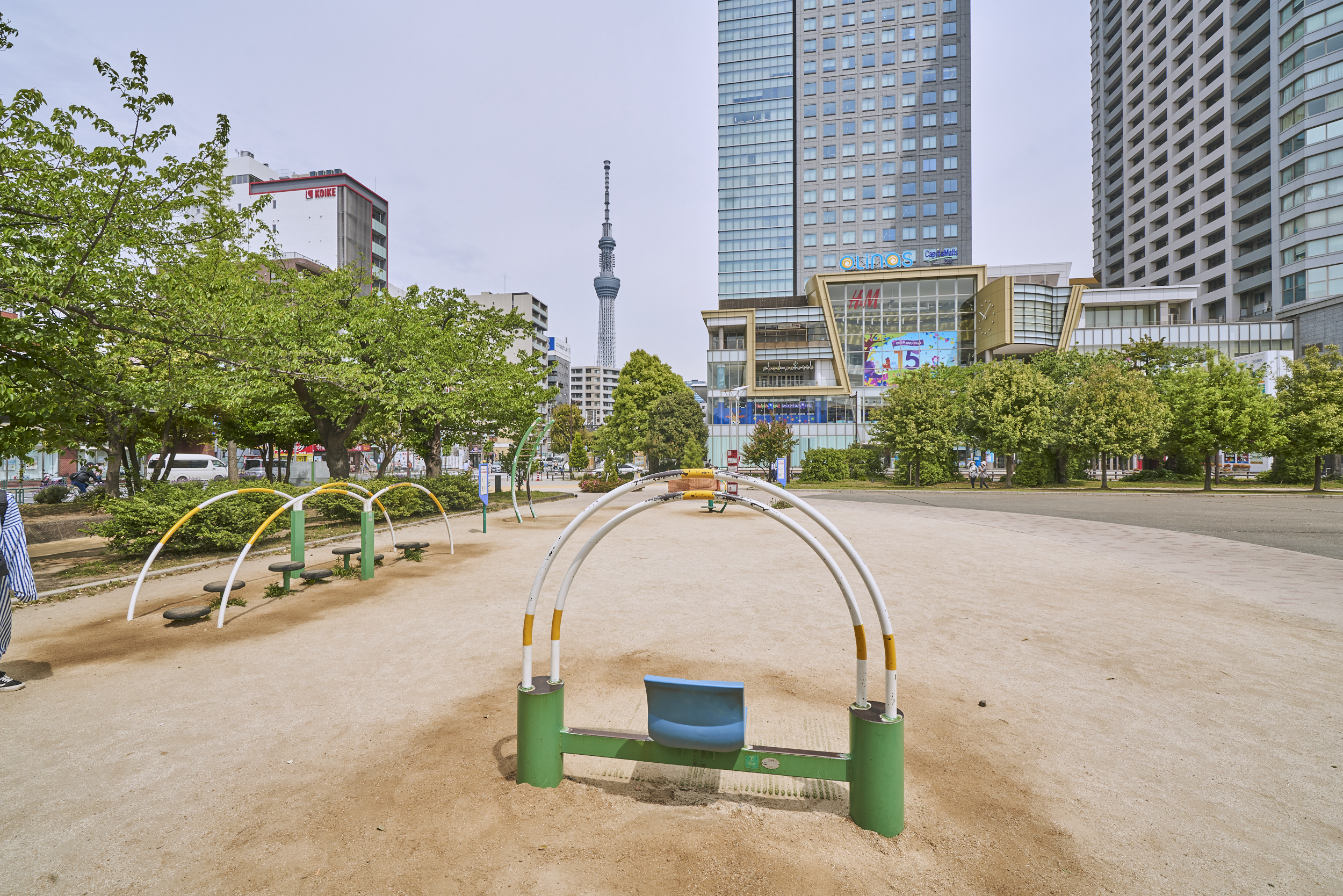 関東大震災の復興事業の一環として、1928年に開園した墨田区立の公園。その後も整備が進み、体育館や噴水などが作られました。2006年には、錦糸町の再開発により、公園のすぐそばに商業施設「オリナス」がオープン。2011年には公園全体の再整備に併せて、錦糸公園のメインの遊具ともいえる複合遊具もリニューアル。2012年には完成したスカイツリーの姿を見ることもでき……と、常に進化をし続けている公園です。