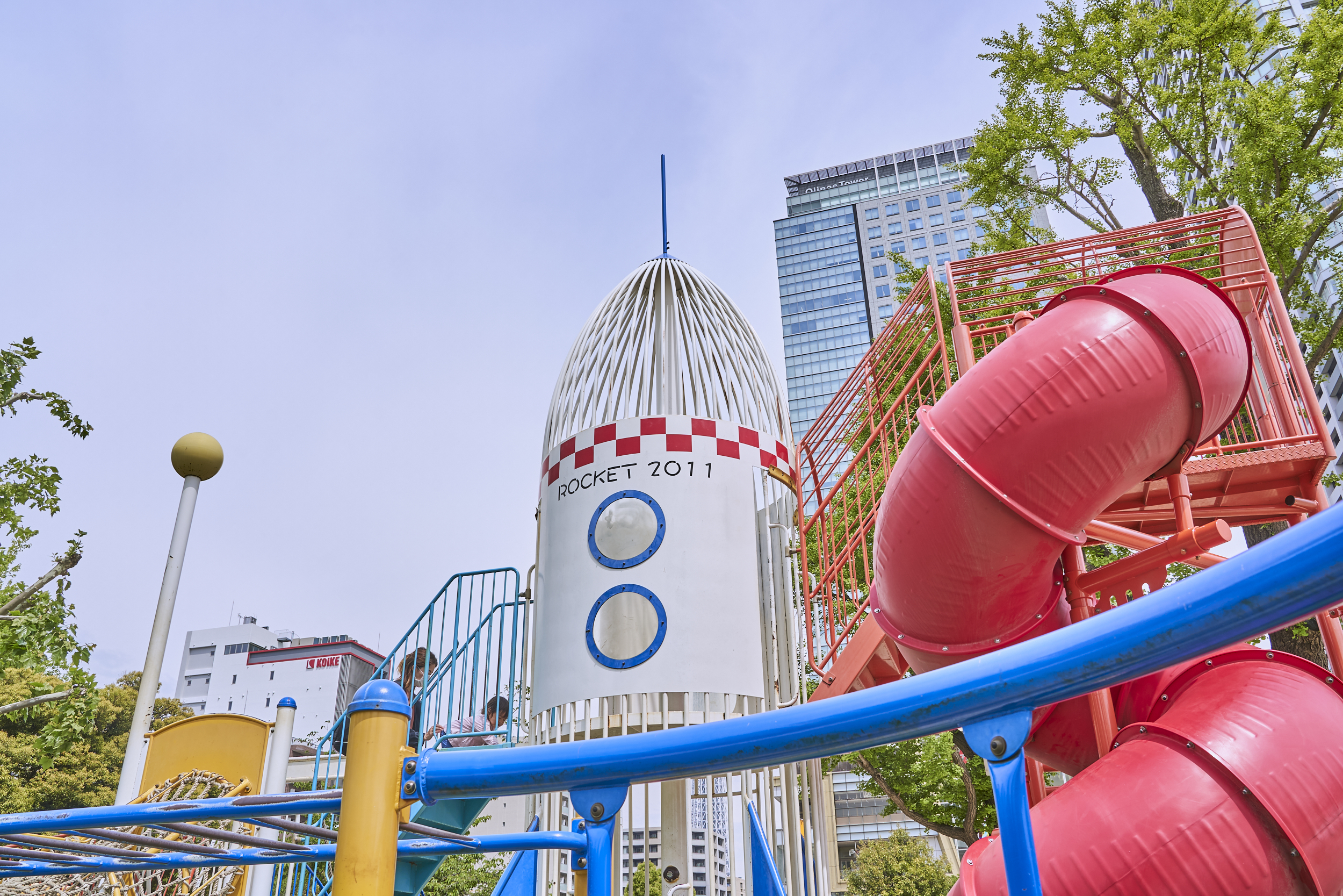 3歳くらいまでの小さな子ども連れであれば、「ちびっこ広場」へ。中心にある複合遊具は近隣の園児も訪れていて、子どもたちでいつも賑わっています。人が多すぎて遊べない……という場合でも、周辺にはブランコやちょっとした遊具や砂場などもあり、パパママと子どもが一緒にゆっくり遊ぶにはもってこい。6歳以上なら、「ふれあい広場」の複合遊具は必須! シンボルでもある白いロケットタワーに登れば、スカイツリーにまるで近づけたような感覚を味わうことができちゃうかも。たっぷりと遊具で遊んだら、お次は噴水を囲む「水と緑と花の広場」へ。自然と触れ合ったり、柔らかいボールを使ったボール遊びやかけっこをしたり……と、緑いっぱいの中、自由に遊ぶことができます。春には桜も楽しめますよ。