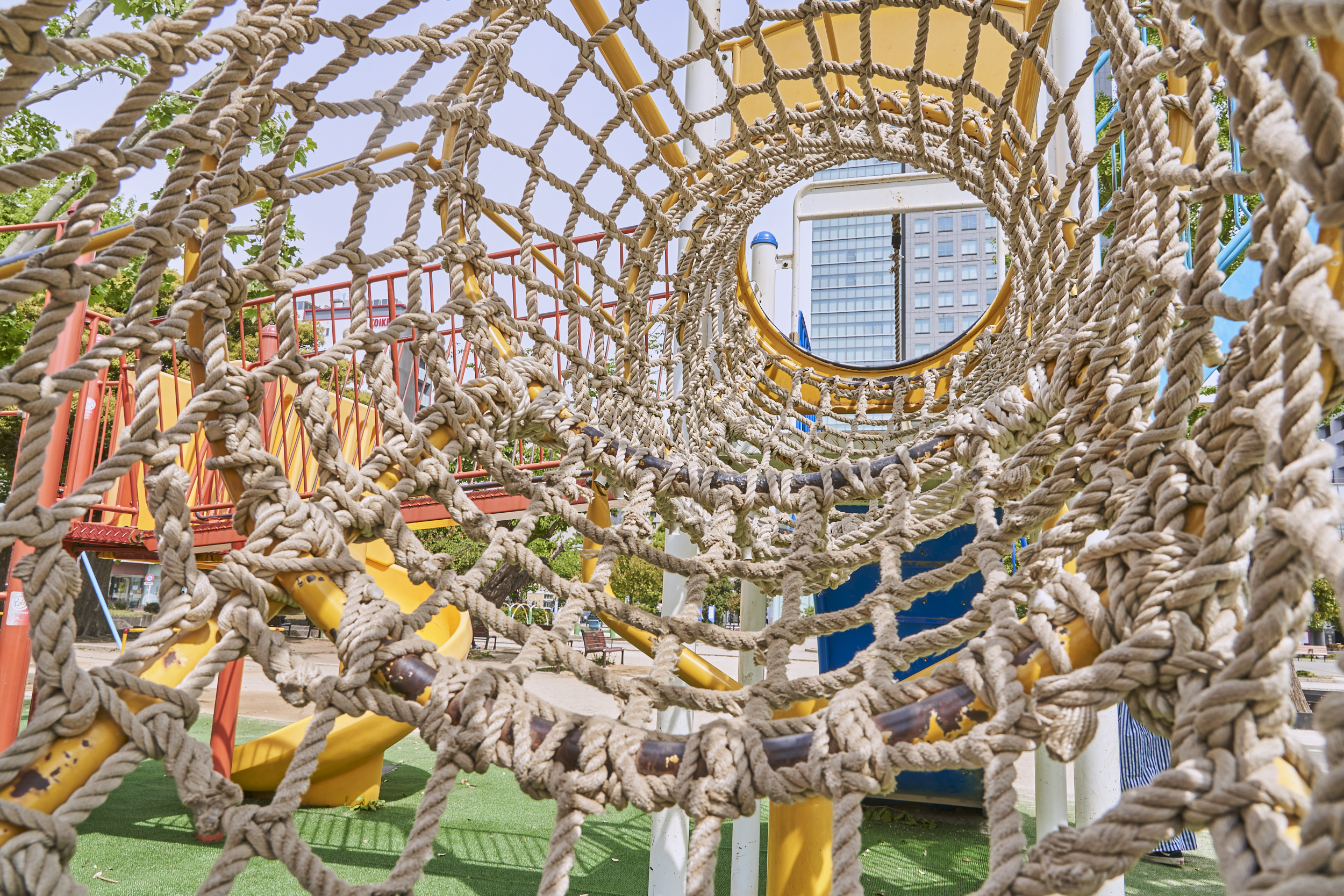 ロケットタワーへ登る階段へと続く、網状のトンネル。タワーへはいろいろな方法で登って楽しめるのが、この複合遊具の楽しいところ!
