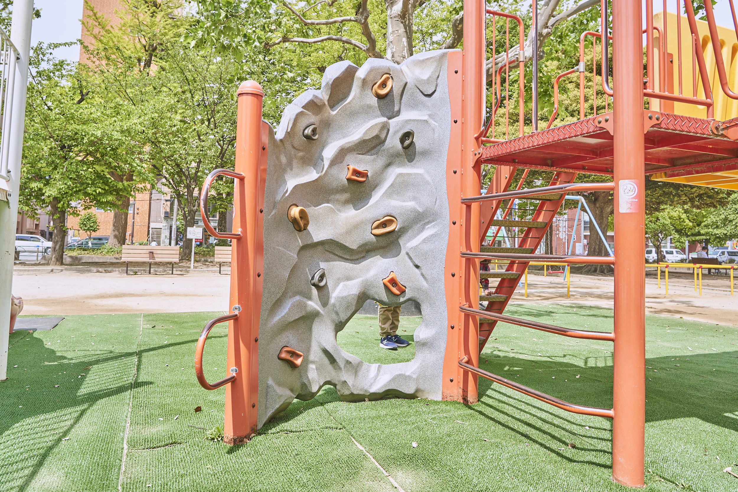 複合遊具の壁にはプチボルダリングも。そこまで高さがないので、安心して楽しめます。簡単そうに見えますが、意外と難易度高い!