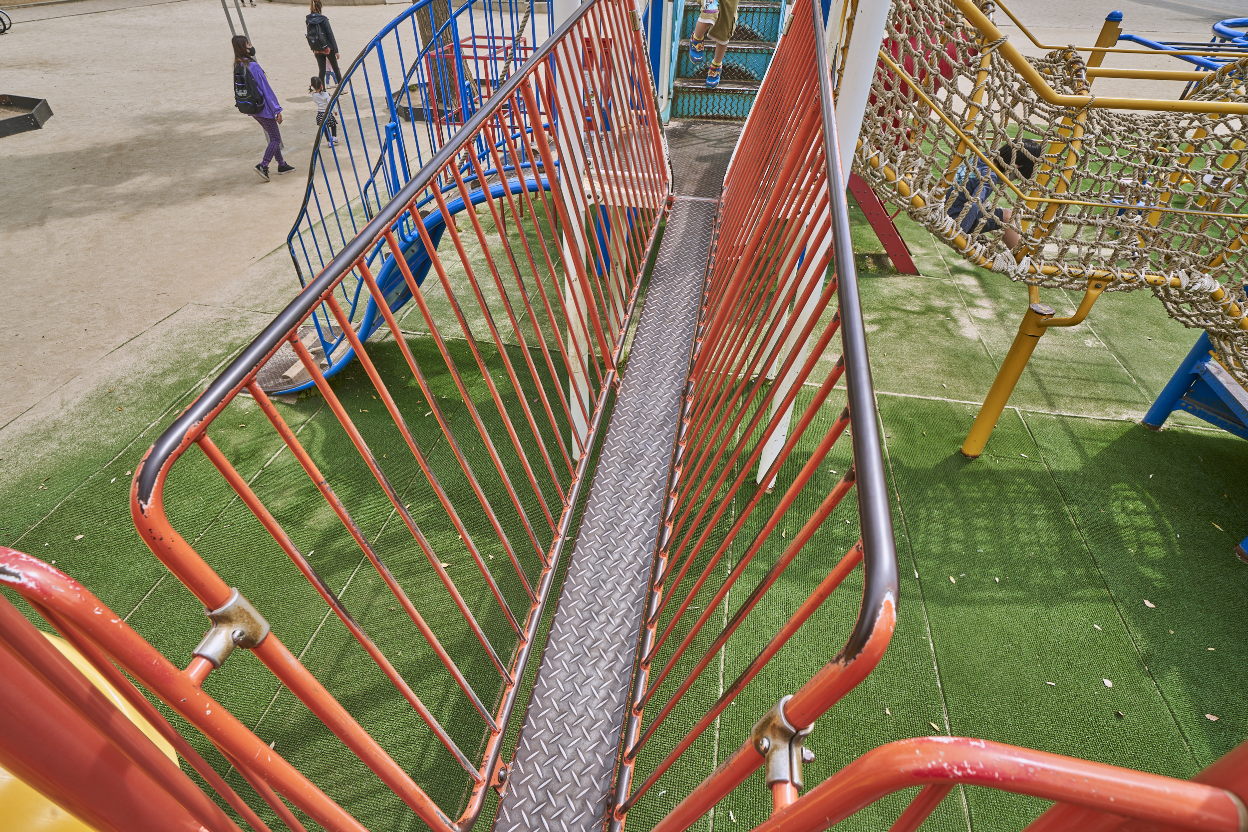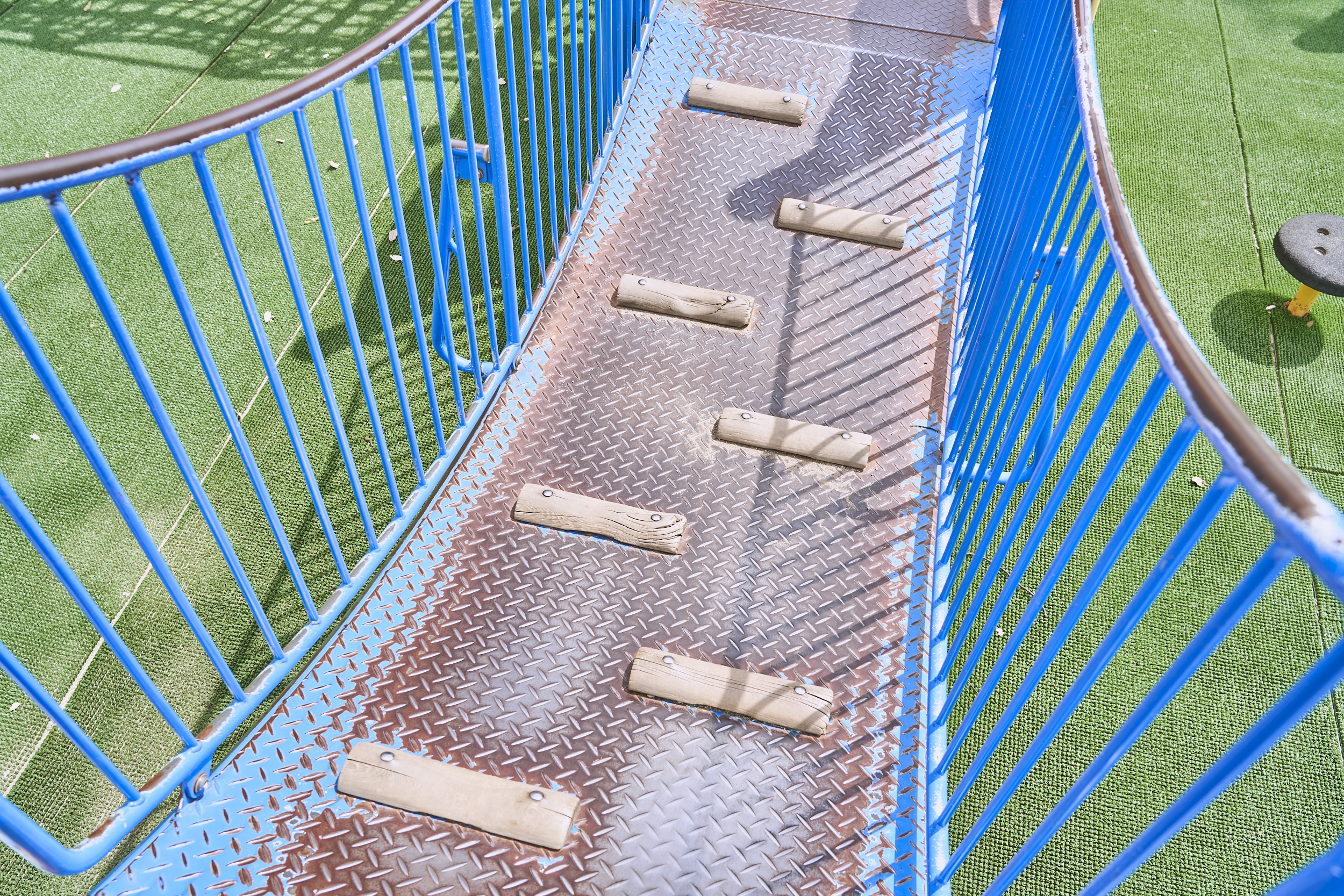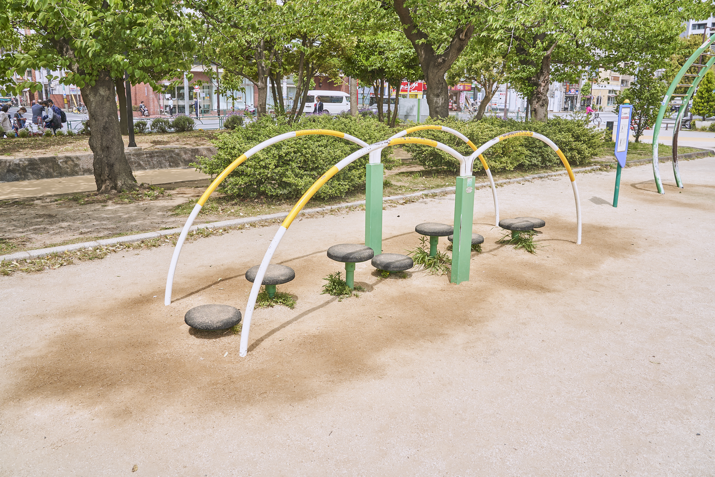高齢者も使える健康遊具もちらほらと見られます。こちらは高さの違うステップを渡ることで、足腰の運動になる遊具。手すりを利用しつつバランスをとりながら進んでいこう!