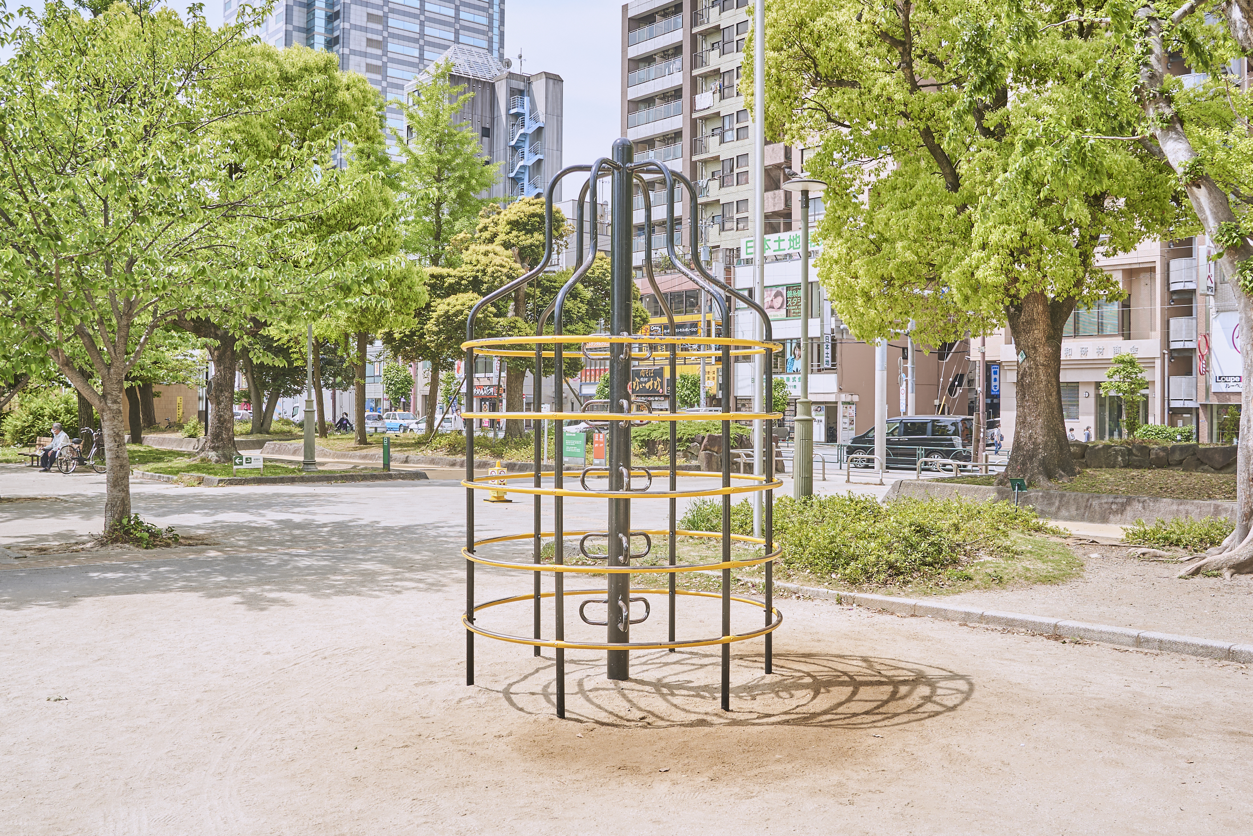 複合遊具だけでなく、まわりにも遊具が点在しています。こちらはユニークな形のジャングルジム。登るだけでなく、ぶらさがり運動もできますよ。